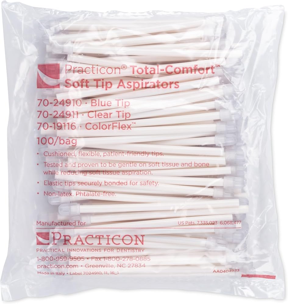 Total-Comfort Soft Tip Aspirators feature cushioned, flexible, patient-friendly tips. Tested and proven to be gentle on soft tissue and bone while reducing soft tissue aspiration. Elastic tips are securely bonded for safety. 100% non-latex. 6" long. 100 aspirators per bag with white or clear tubing.