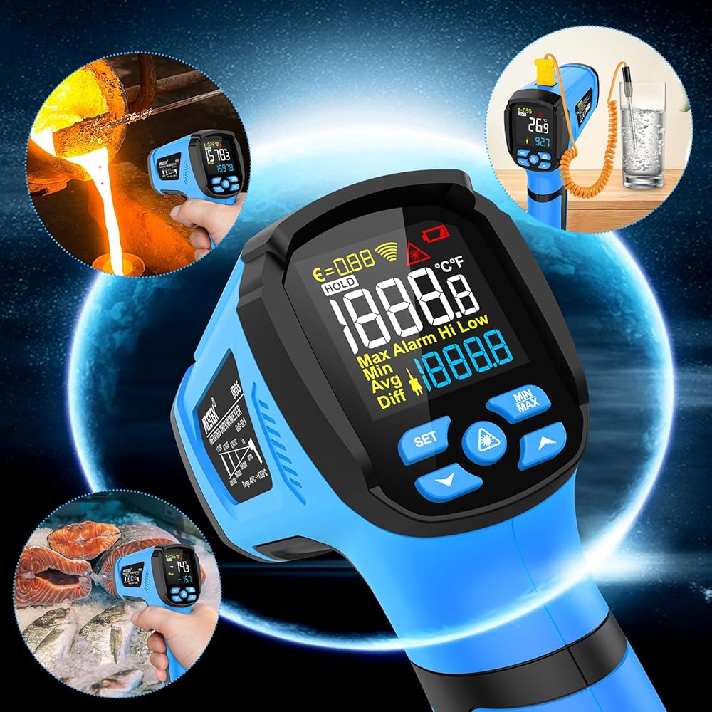 دقة عالية وانبعاث قابل للتعديل - مقياس حرارة بالأشعة تحت الحمراء غير ملامس من MESTEK مع نظام توجيه بالليزر 13 نقطة، يوفر قياسات دقيقة من -58 درجة فهرنهايت إلى 1472 درجة فهرنهايت (-50 ~ 800 درجة مئوية). أيضًا مع انبعاثية قابلة للتعديل من 0.1 إلى 1.0، مما يسهل قراءات درجة الحرارة الدقيقة عبر المواد المختلفة. يمكن لأجهزة الاستشعار الفرنسية HTU20 عالية الجودة توفير قياس يمكن الاعتماد عليه خلال 0.5 ثانية. تم تصميم مقياس الحرارة بالأشعة تحت الحمراء هذا خصيصًا للأشياء غير الحية، وليس للإنسان أو الحيوانات.
