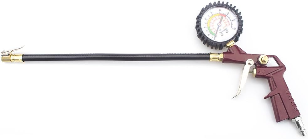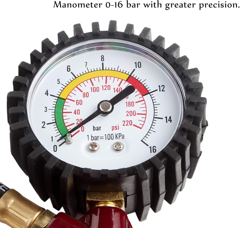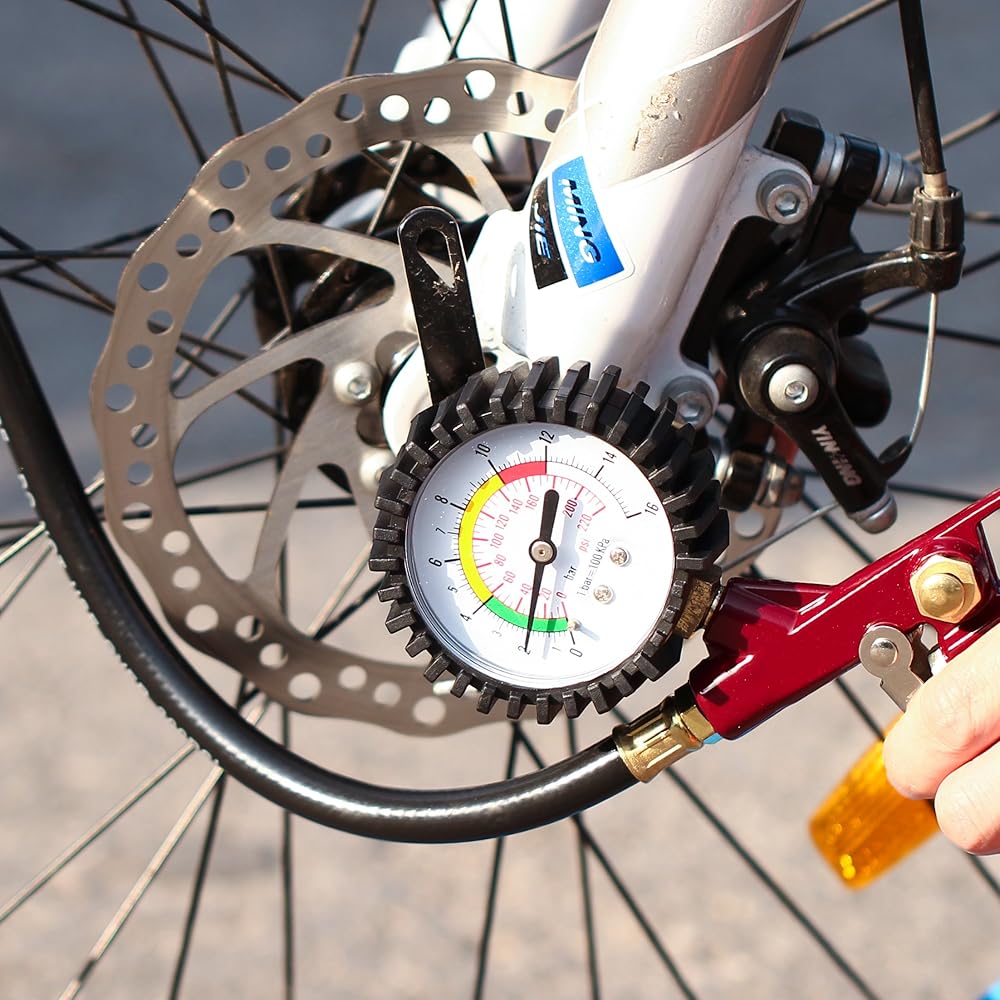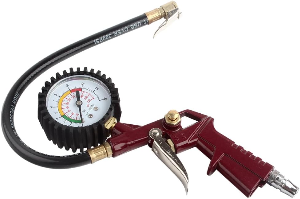 منفاخ الإطارات مع مقياس الضغط 0-220 رطل لكل بوصة مربعة، مقياس ضغط الإطارات مع منفاخ مع خرطوم مطاطي وقابس توصيل سريع للسيارة والشاحنة والدراجة والدراجات النارية، أحمر