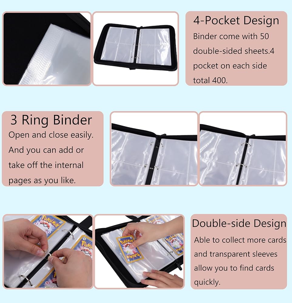 • Design: The card binder features 3 ring binders on the inside. The transparent card sleeves allows you to show them to friends without taking cards out. The durable strap allows you to easily carry the card binder.