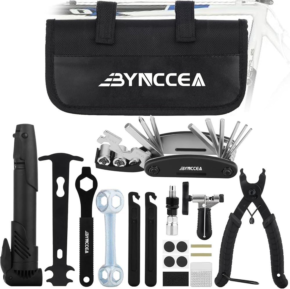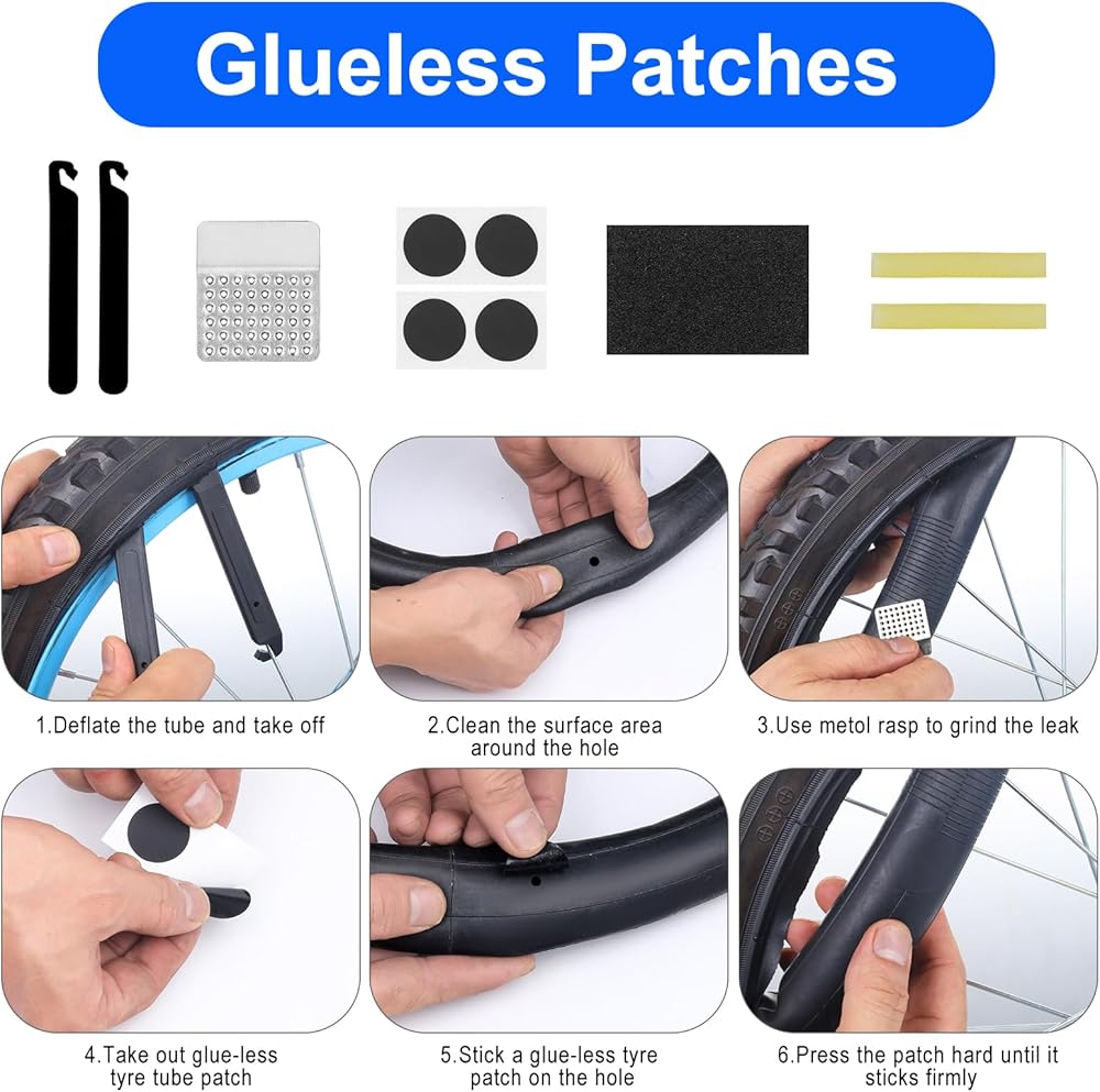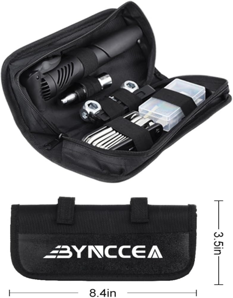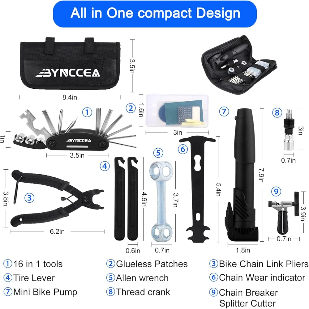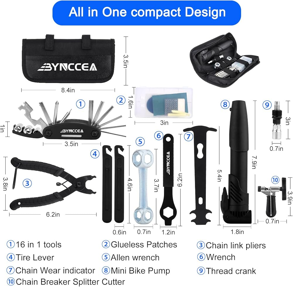 • مجموعة أدوات إصلاح الدراجة الكل في واحد: تحتوي على مضخة دراجة صغيرة، 2 × رافعة إطارات دراجة بلاستيكية، مفتاح ربط عظمي، طقم إصلاح أنبوب (رقع لاصقة)، كرنك خيط، مفتاح ألين، مجموعة مفاتيح دراجة عالية الصلابة 16 في 1، دراجة سوداء شنطة