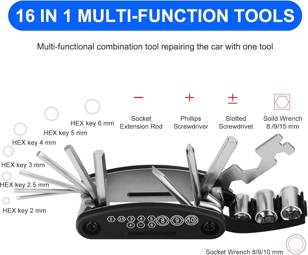 • أداة إصلاح متعددة الوظائف 16 في 1: مفتاح ربط سداسي 8/9/10/مم، مفتاح ربط صلب 8/10/15/مم، مفتاح ربط سداسي 2/2.5/3/4/5/6 مم، مفتاح ربط، مفك براغي مشقوق ، مفك براغي فيليبس، قضيب تمديد المقبس