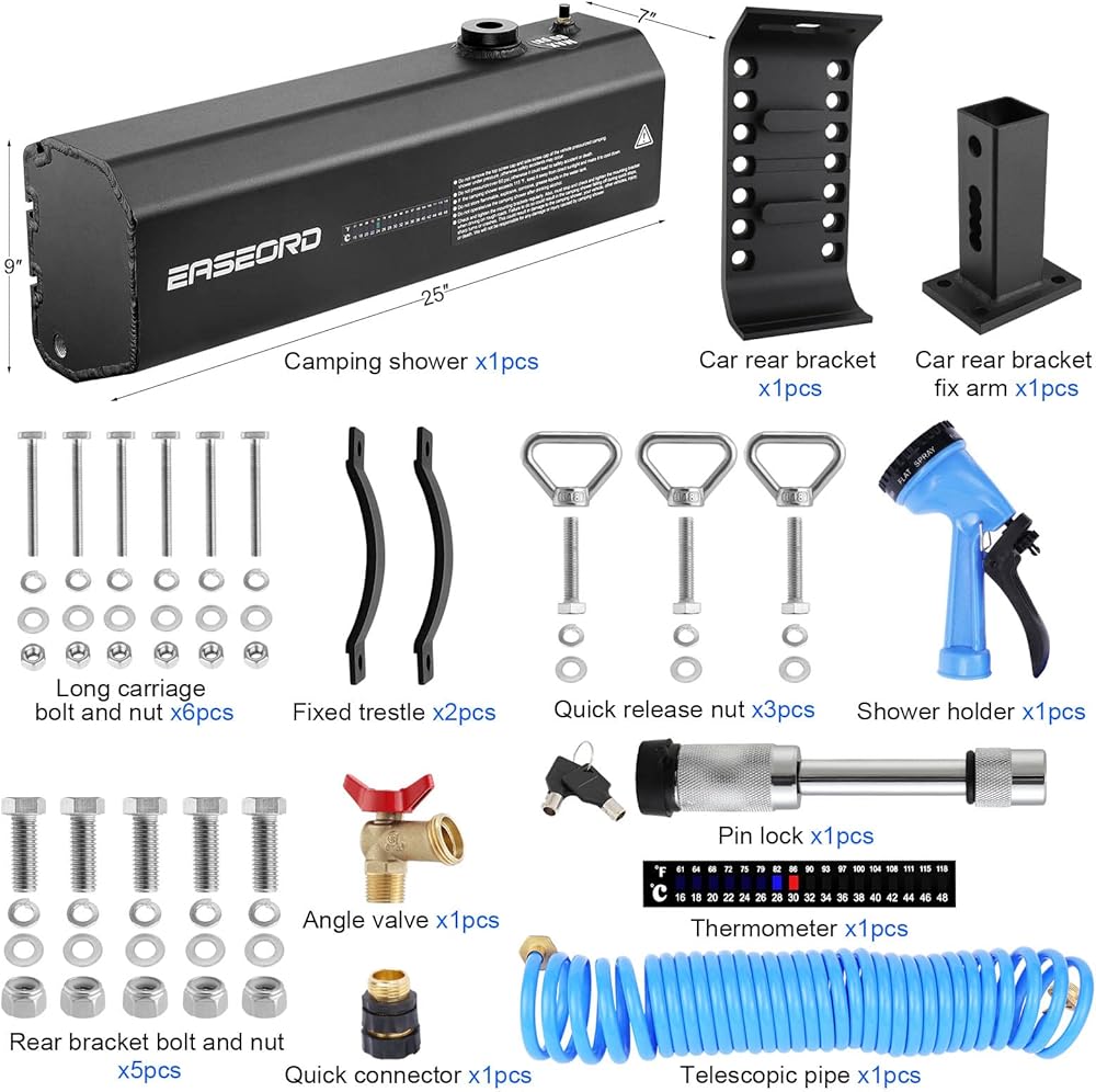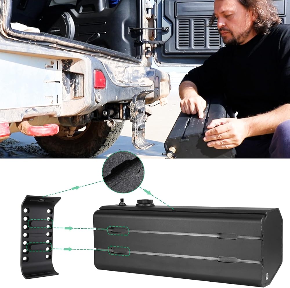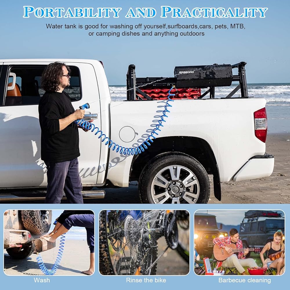 مريح ومحمول: خزان المياه المضغوط لشاحنتك أو سيارات الدفع الرباعي أو المركبات على الطرق الوعرة يبلغ طوله 25 بوصة × عرض 9 بوصة × ارتفاع 7 بوصة، وفارغ 22 رطلًا، ويمكن تركيب خزان مياه الدش للتخييم على حوامل حامل السقف، وحوامل وصلة الجر، وحوامل المصد.