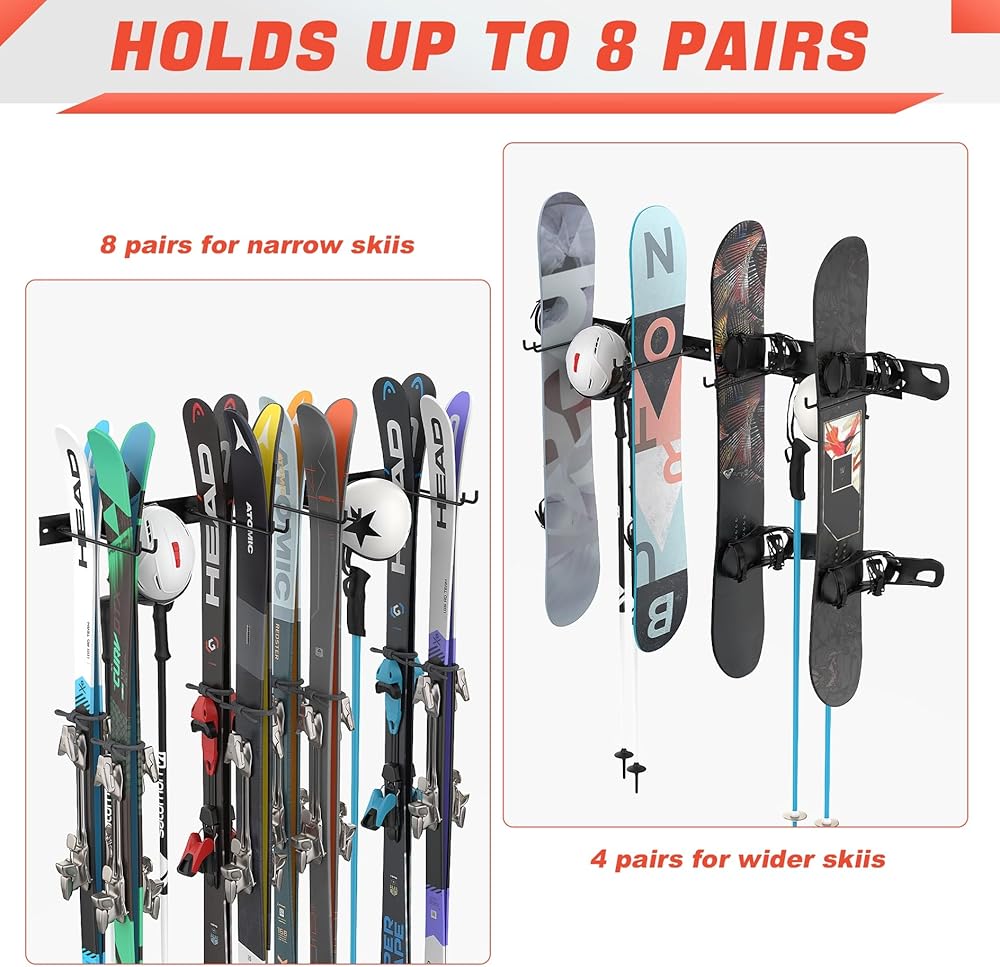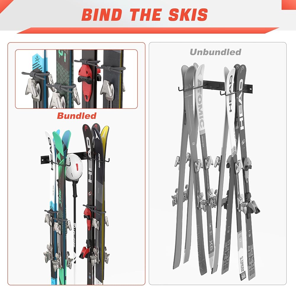 تخزين موفر للمساحة: بطول 11.5 سم، يستوعب رف التزلج الزلاجات الضيقة والواسعة، ويمكنه حمل ما يصل إلى 8 أزواج من الزلاجات. يوصى بربط الزلاجات في الأسفل لمنع التأرجح، مما يضمن تخزينًا آمنًا ومنظمًا.