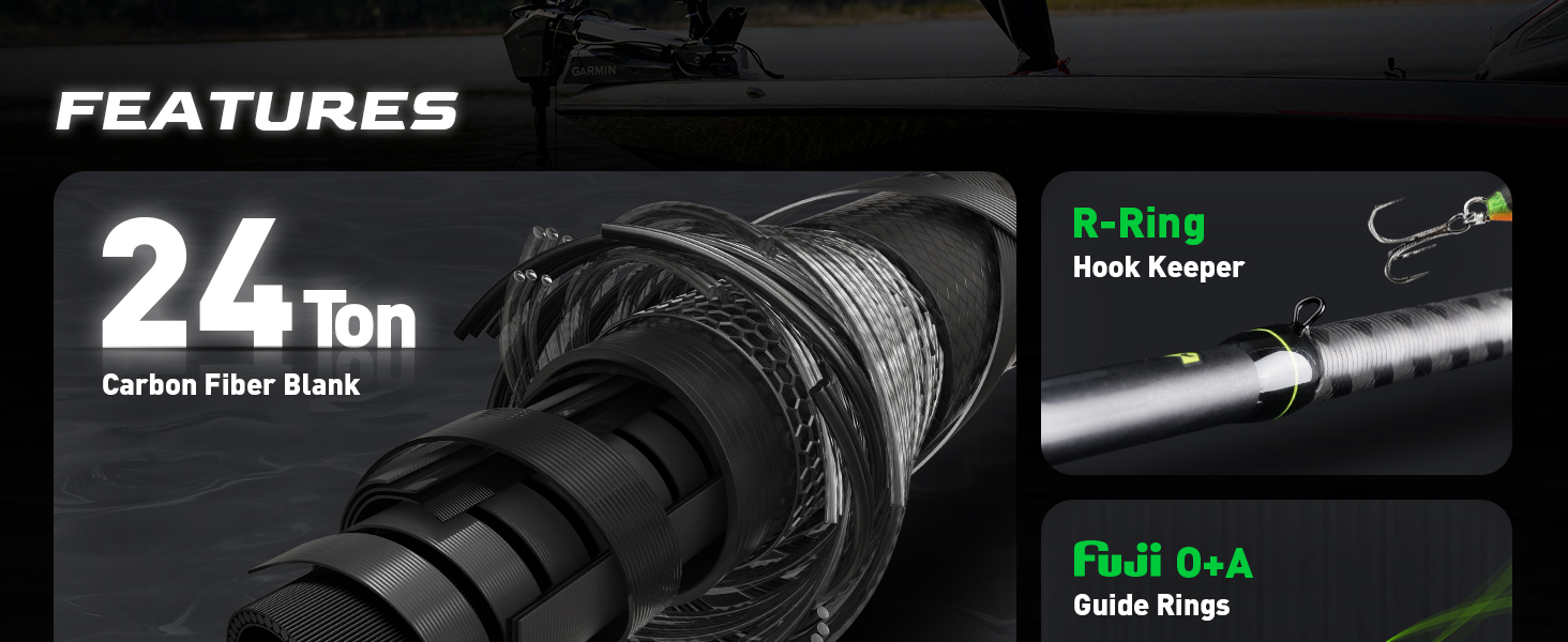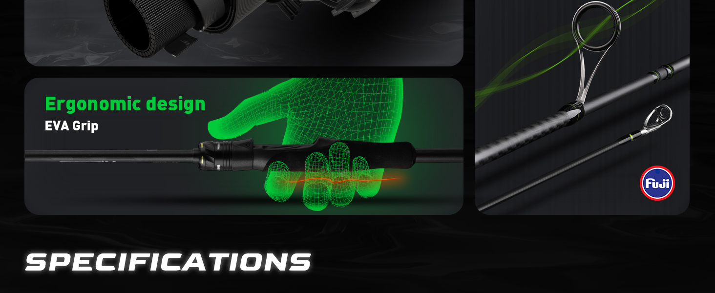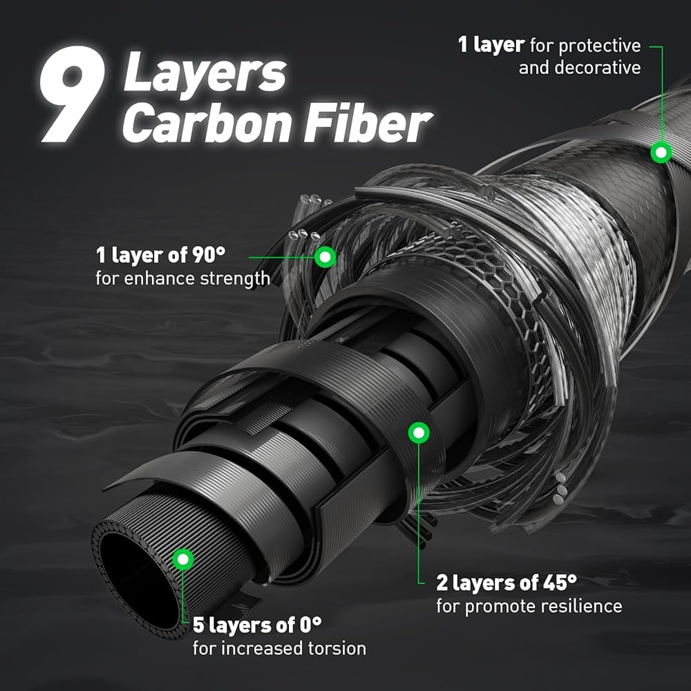 مقبض من ألياف الكربون - المقبض مصنوع من ألياف الكربون، مما يوفر إحساسًا بخفة الوزن مع الحفاظ على الحساسية العالية. نضمن لك عدم تفويت حتى أدق اللدغات.