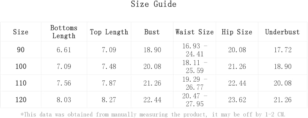 110:Bottoms Length:7.6IN,Hip Size:22.4IN,Waist Size:19.3-26.8IN,Bust:21.3IN,Top Length:7.9IN,Underbust:20.1IN