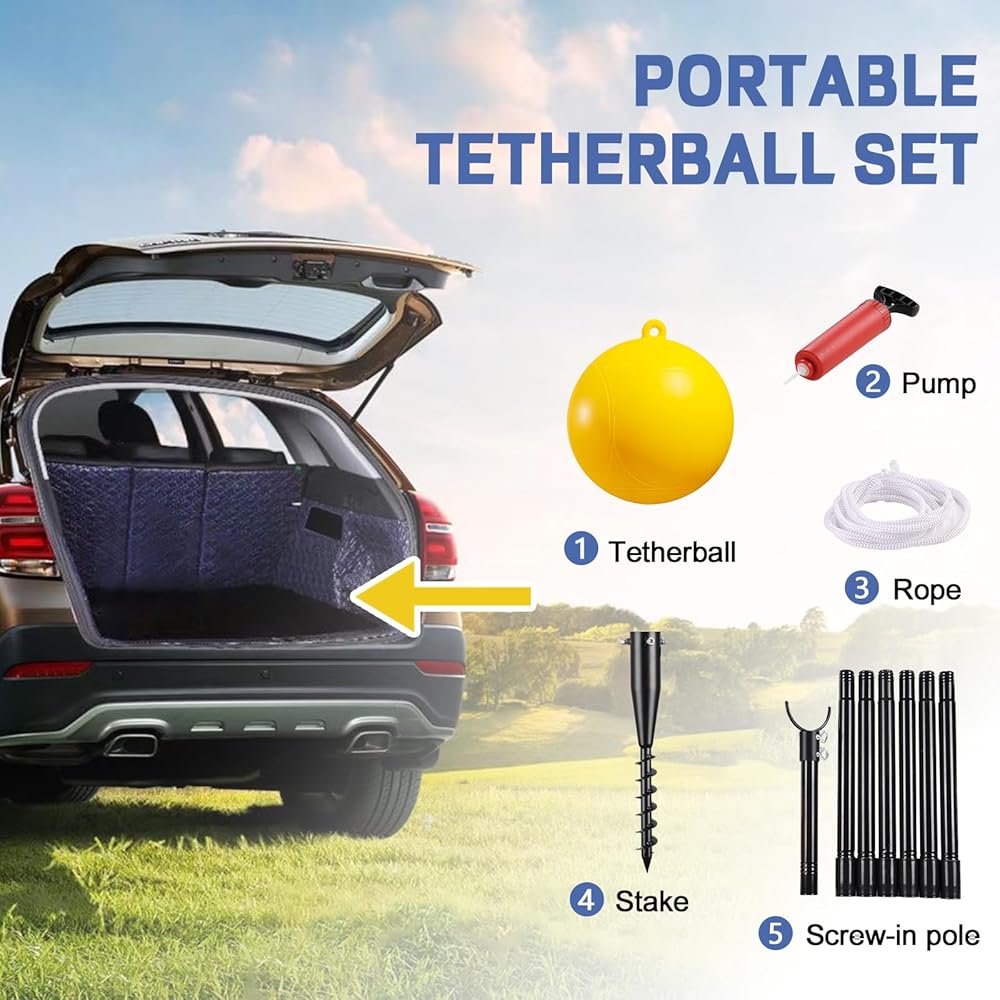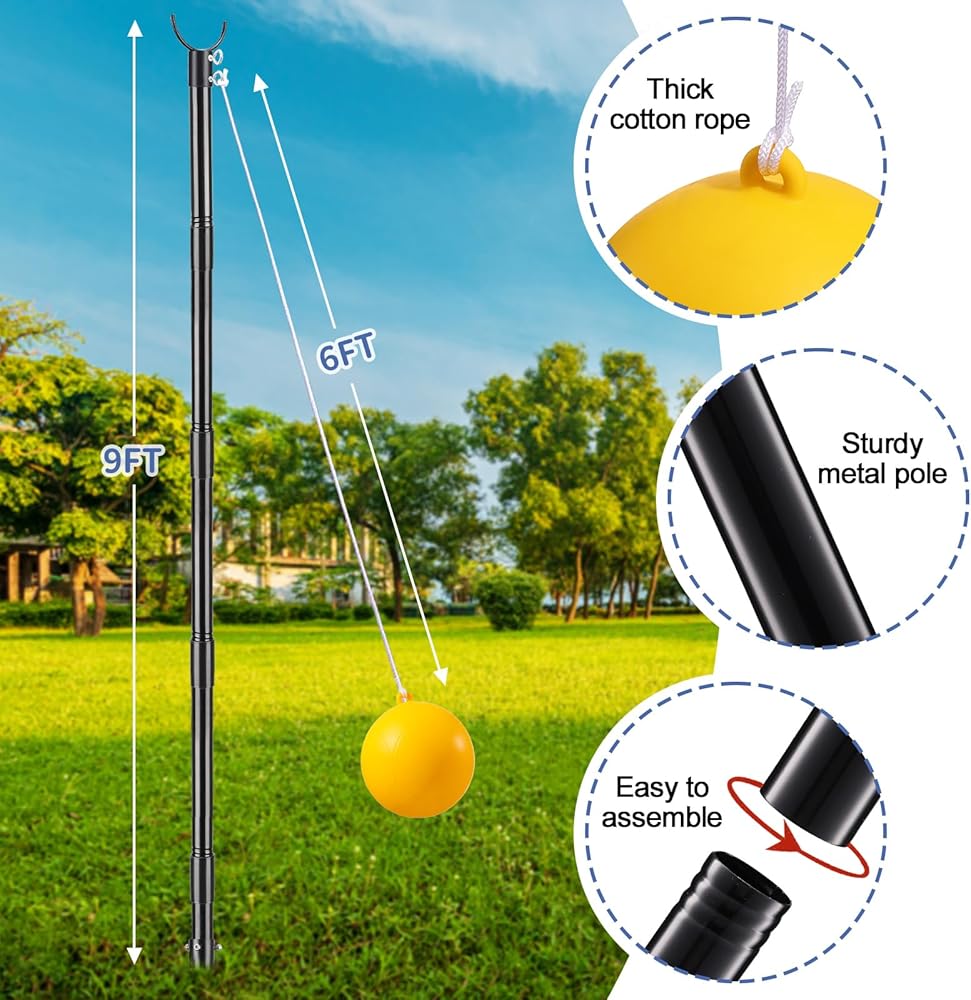Portable & Easy to Assemble: this tetherball pole with screw-in design, portable for car trunk for garden, beach, camp, in front yard, backyard, playground, party and other outdoor activities to gather kids, adults and dogs. And easy to set up it in one minutes. The total height of the Tetherball set is 9.1FT, you can also adjuste the height by adding or removing the extension poles.