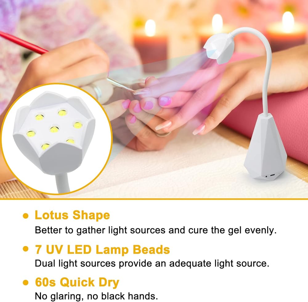 🔥【Dual Light Source & 60s Quick Dry】 Wavelength: 365-405nm, 7 UV LED dual light source lamp beads, which provide adequate light source to help your nail art dry out quickly and efficiently, only needs 60s. The novelty lotus head is good to gather light source and cure the gel evenly without a dead zone.