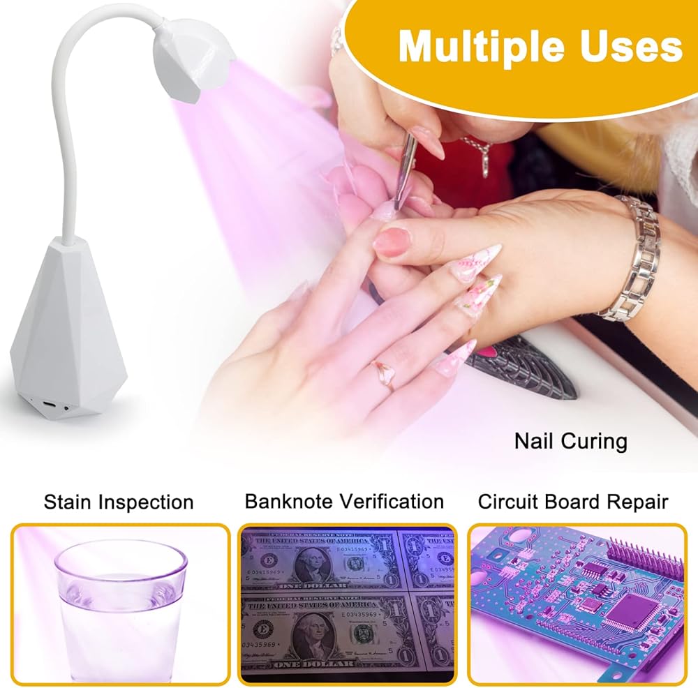 🔥【Multipurpose UV LED Light】 Provide: 1* UV nail lamp, 1* USB, 1* UV gloves. Not only can be used for bulb polishing, repairing phones, detecting fluorescent paint, Ultraviolet curing, resin art, and stain inspection, but also as a great gift for your family and friends for birthday parties, Halloween, Christmas, anniversaries, or Valentine's day.