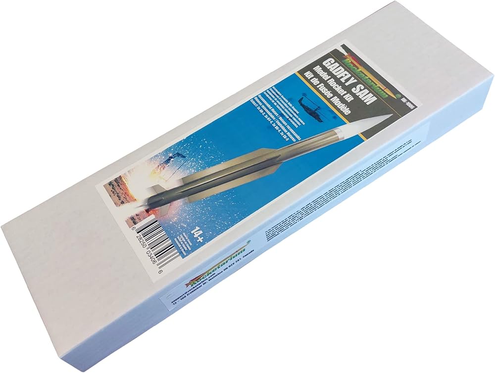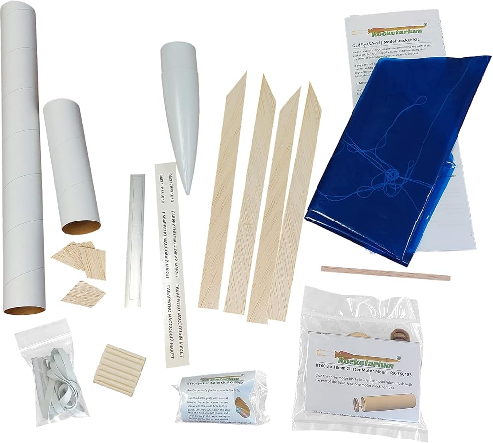 This is the model rocket kit of SA-11 missile. NATO reporting name "Gadfly". This Gadfly military scale rocket flies on a cluster of three 18mm rocket engines. Fly it on three A8-3's for lower flights on smaller fields. Or, go all out with three C6-5 engines for an exciting launch. The kit comes with all parts needed to build this rocket including plastic nose cone, ejection baffle, decals, pre-cut fins and rings and pre-assembled 18" parachute. No engine hooks are provided with this kit, as there's no room for them. Dimensions: Overall length : 26.7" Diameter : 1.64" (BT60) Weight : 5.08 oz. Requires (not included) Assembly, Wood glue, Hobby Knife, Sandpaper, Masking Tape, Primer and Paint needed to build this rocket. Launch system with 3/16" Launch Rod, Cluster-Compatible Launch Controller and Rocket Motors needed to launch this rocket and are not included. Recommended Motors Estes 3 x A8-3, 3 x B4-4, 3 x B6-4, 3 x C6-5