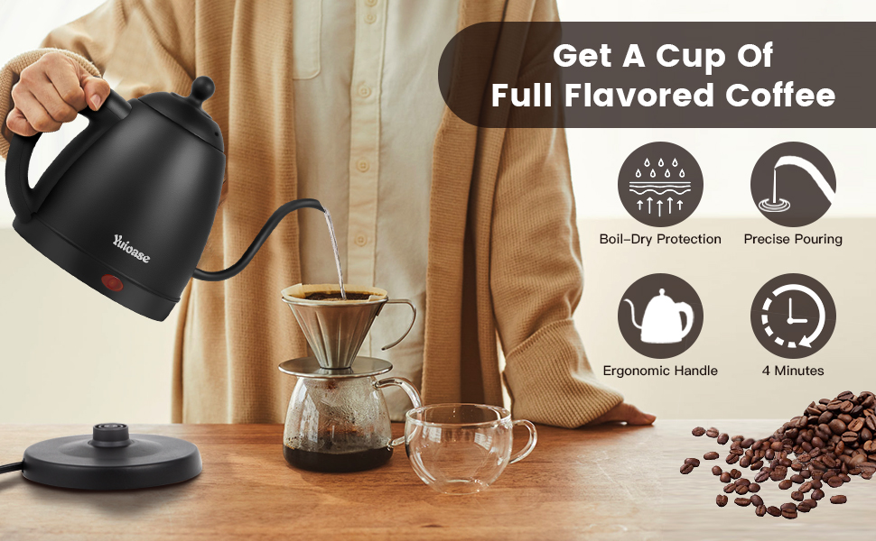 【إيقاف تلقائي وحماية من الغليان الجاف】 من أجل سلامتك، تأكد دائمًا من إغلاق الغطاء بشكل آمن عند غليان الماء. تتميز غلاية القهوة بالحماية من الحرارة الزائدة وآلية الإغلاق التلقائي التي تمنعها من الغليان الجاف. سيتم إغلاقه عندما يصل الماء إلى درجة الغليان الكامل أو عندما يصبح فارغًا تقريبًا. ضمان الاستخدام الآمن الخاص بك.
