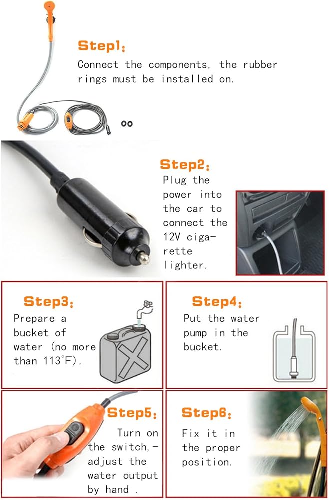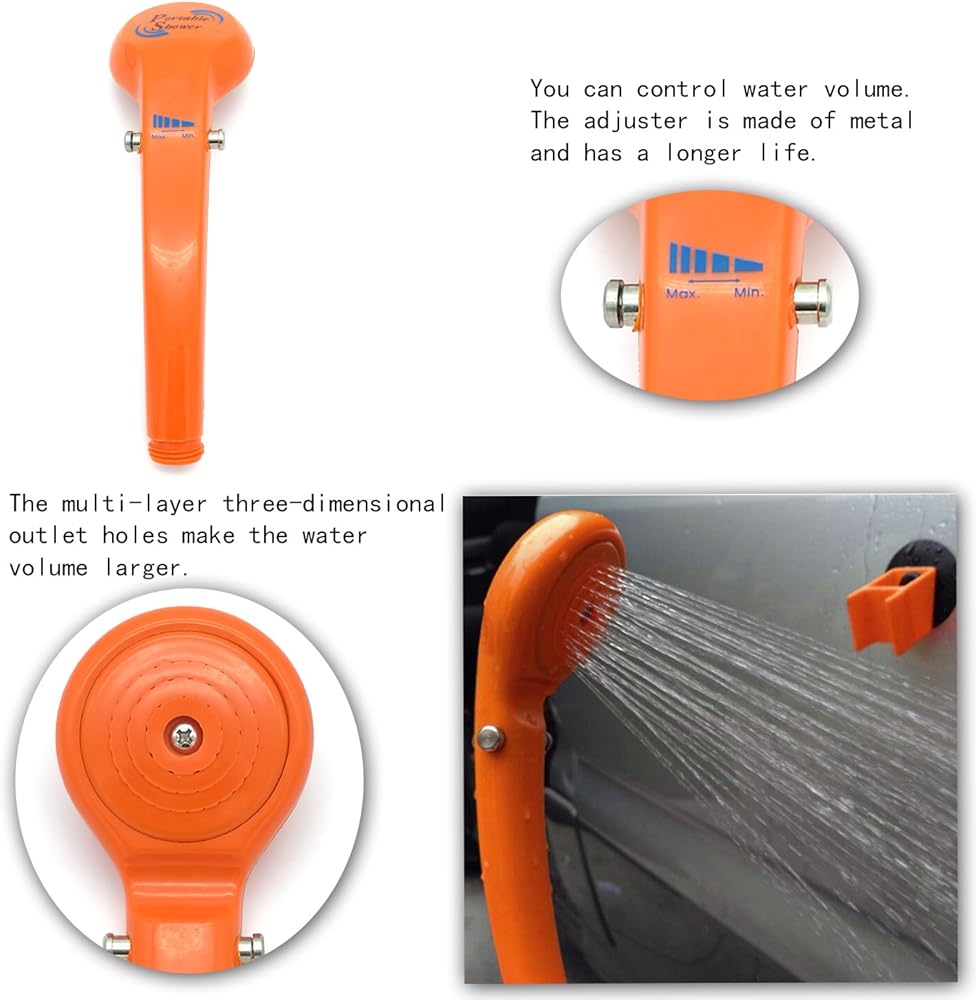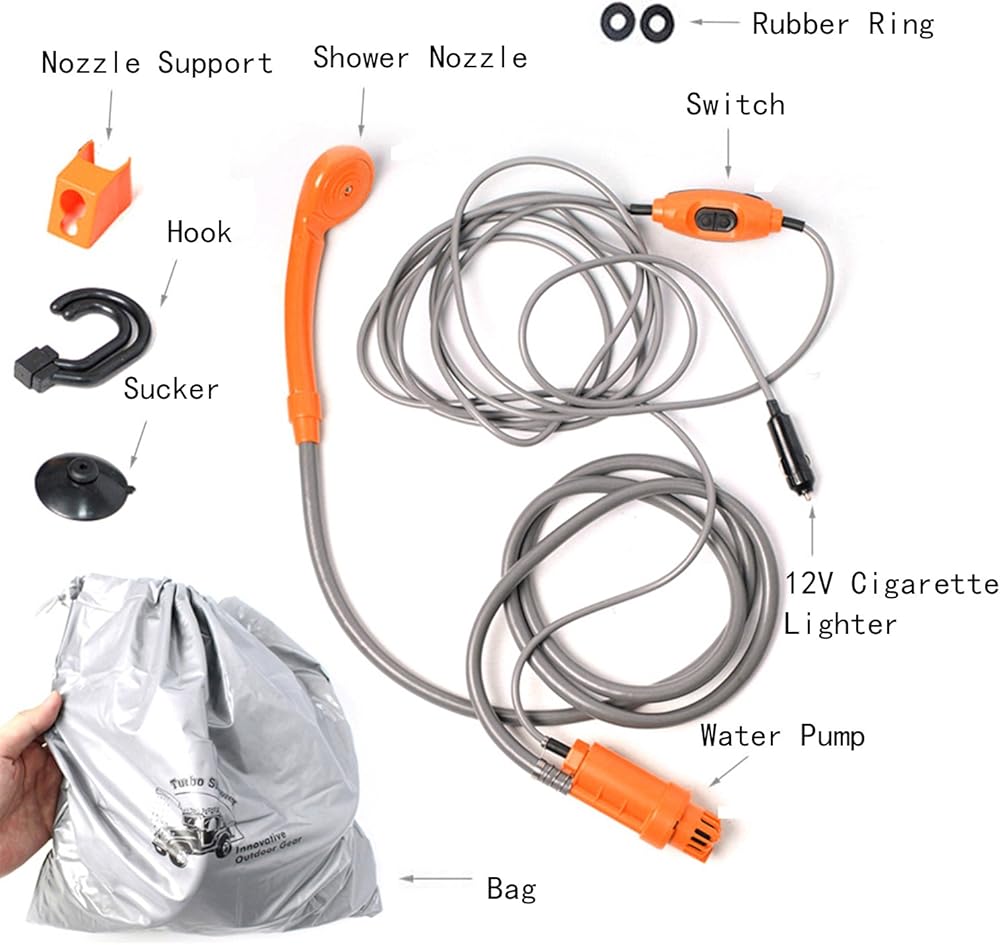2. تصميم محمول - خفيف الوزن، وصغير الحجم، ويمكن وضع جميع أجزاء الدش في حقيبة متينة مجانية لسهولة التعبئة. يناسب أي مقبس سجائر سيارة 12 فولت، يمكنك الاستحمام في أي وقت وفي أي مكان. إنه خيار جيد لاصطحابه مع التخييم والرياضات الخارجية وحقائب الظهر والمهرجانات الموسيقية.