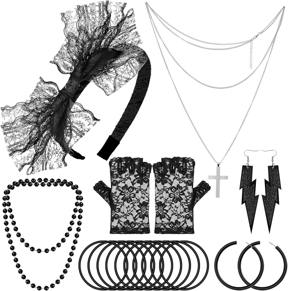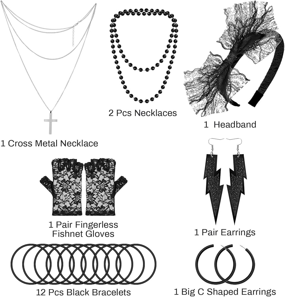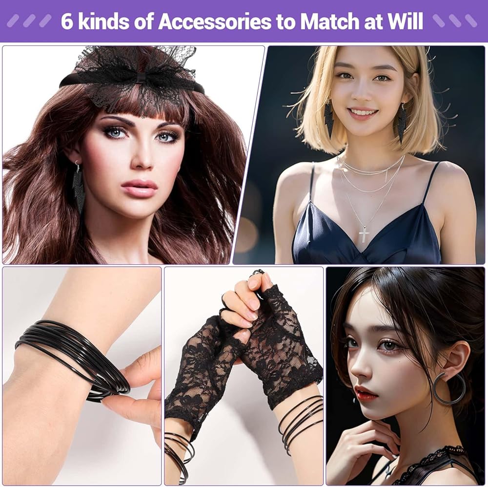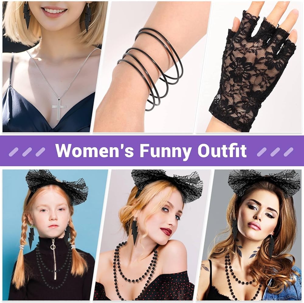GREAT VALUE SET – Paxcoo women's 80s party accessories includes 1pcs lace headband, 2 pair of earrings in different styles, 1 pair fingerless fishnet gloves, 10pcs black bracelets, 1pcs metal necklace and 2pcs plastic necklaces. Great for 80's costume accessories and Halloween costume