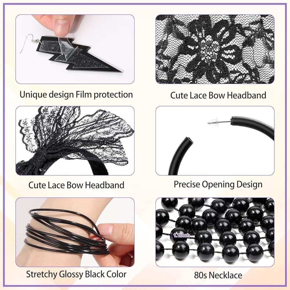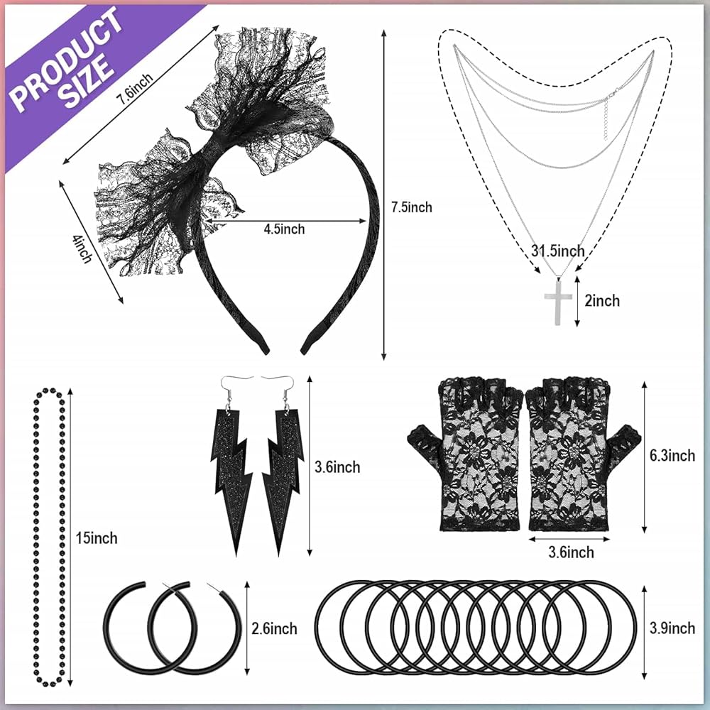 COMFORTABLE TO WEAR – The 80s black lace headband is made of lace and fabric, and the fishnet gloves are super stretchy, earrings and necklace beads are made of plastic, bracelet is made of silicone, all this 80's accessories fit well for most of women and girls
