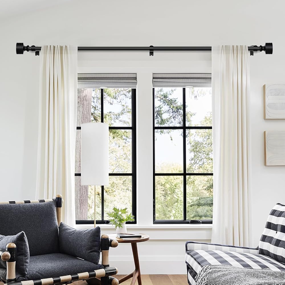 حزمة واحدة من قضبان الستائر السوداء للنوافذ مقاس 28-48 بوصة، وقطرها 1 بوصة، وقضبان ستائر سوداء غير لامعة، وقضبان ستارة نافذة واحدة قابلة للتعديل، مع تيجان تصميم الدمبل