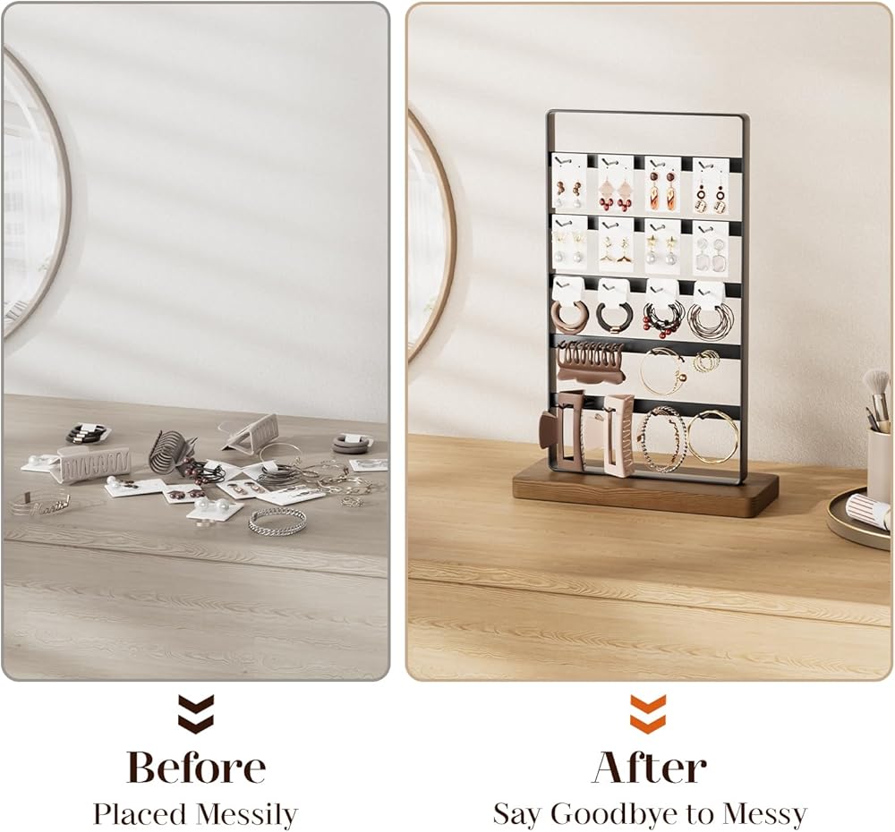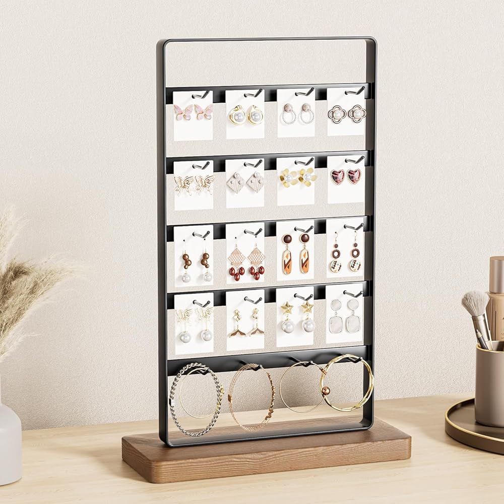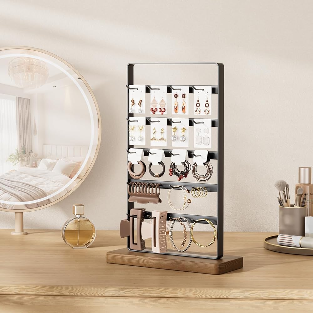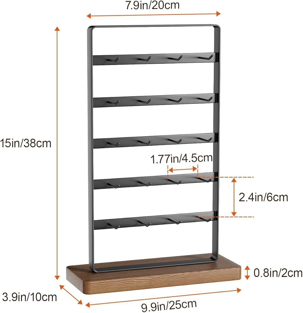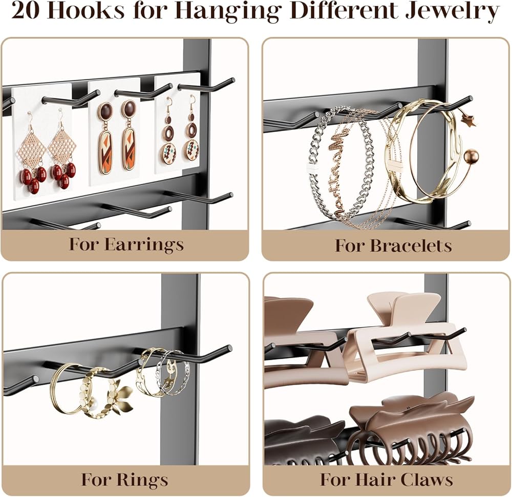【عرض مع 20 خطافًا】: يحتوي حامل العرض هذا على إجمالي 5 طبقات و20 خطافًا للأقراط أو بطاقات القرط أو الأساور أو القلائد أو الخواتم أو مخالب الشعر أو إكسسوارات الشعر أو سلاسل المفاتيح.