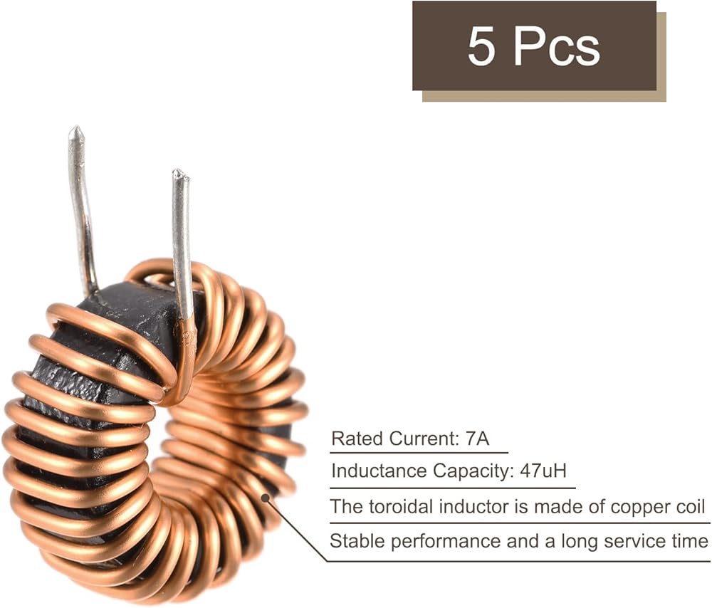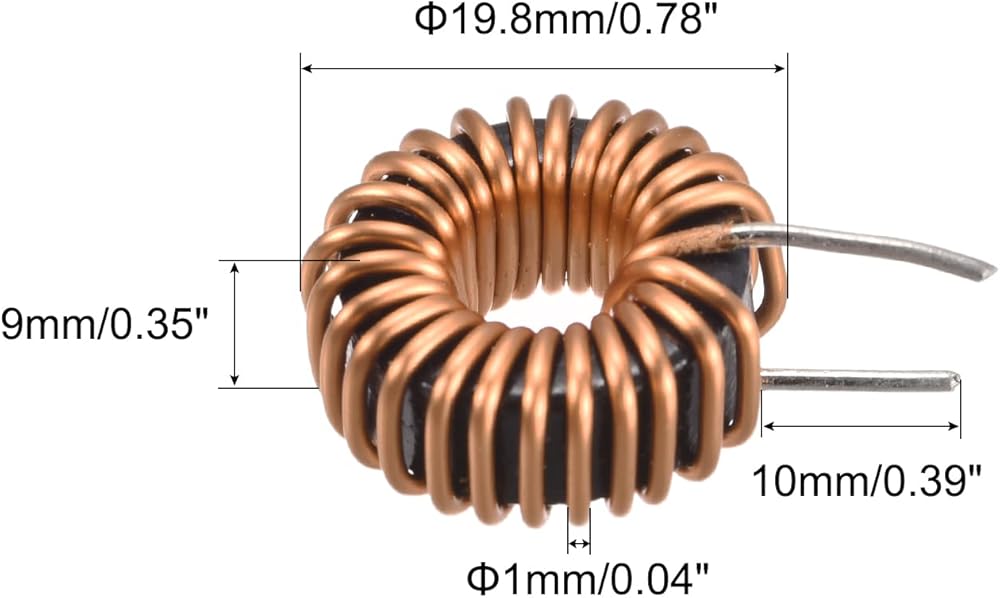 قدرة الحث: 47uH؛ التصنيف الحالي: 7A؛ قطر السلك: 1 مللي متر/0.04 بوصة ؛ القطر الخارجي: 19.8 ملم/0.78 بوصة؛ السُمك: 9 مم/0.35 بوصة؛ طول الدبوس: 10 ملم/0.39 بوصة.