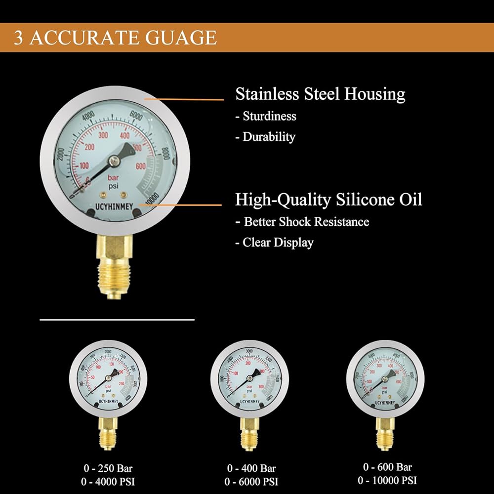 [3 Guages] The max pressure of 3 guages are 250BAR/4000PSI/25MPA, 400BAR/6000PSI/40MPA, 600BAR/10000PSI/60MPA. Housing of each guage is stainless steel and polycarbonate glass, which ensure sturdiness and durability. High-Quality silicone oil is also included to ensure better shock resistance and clear display.