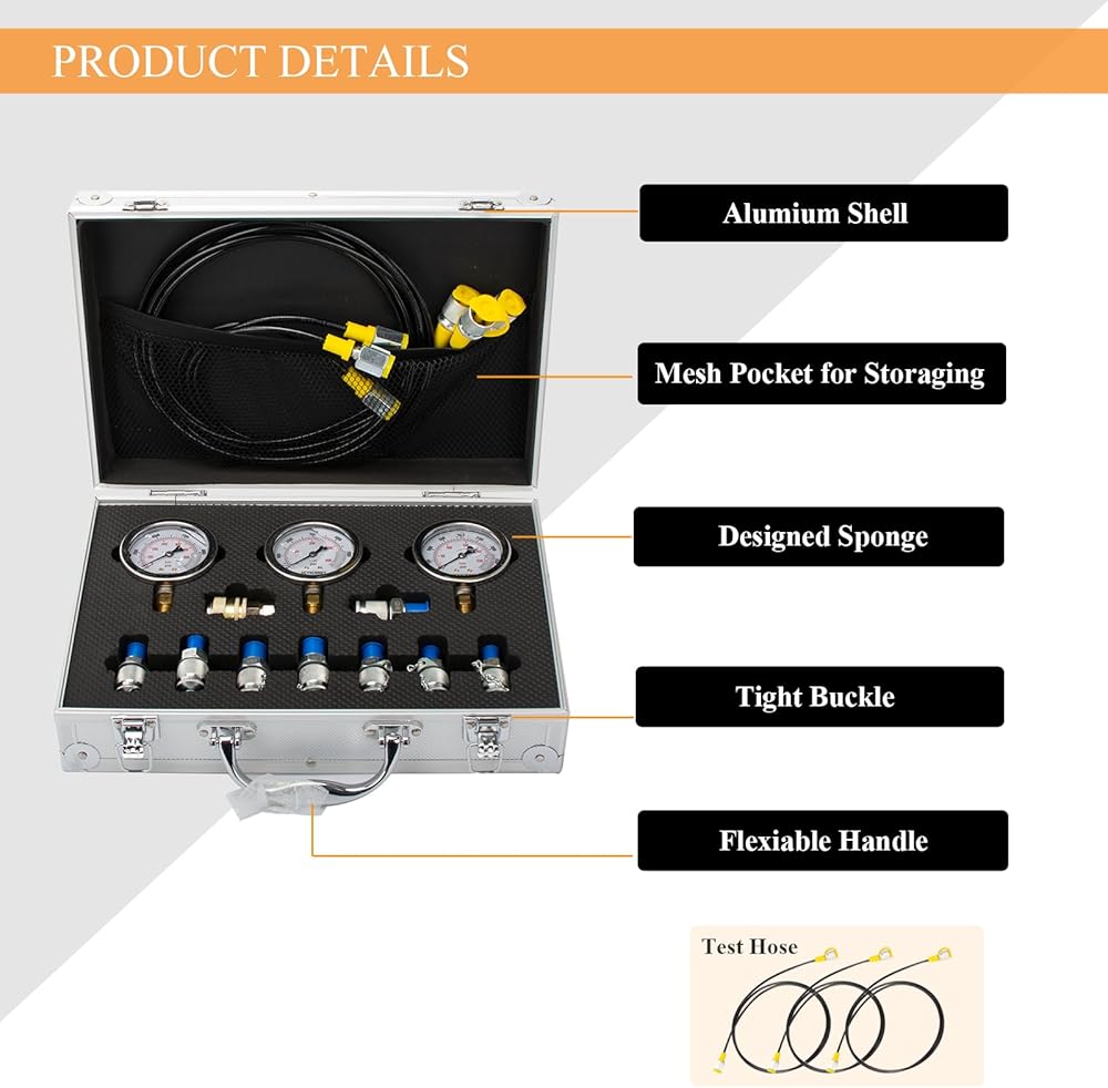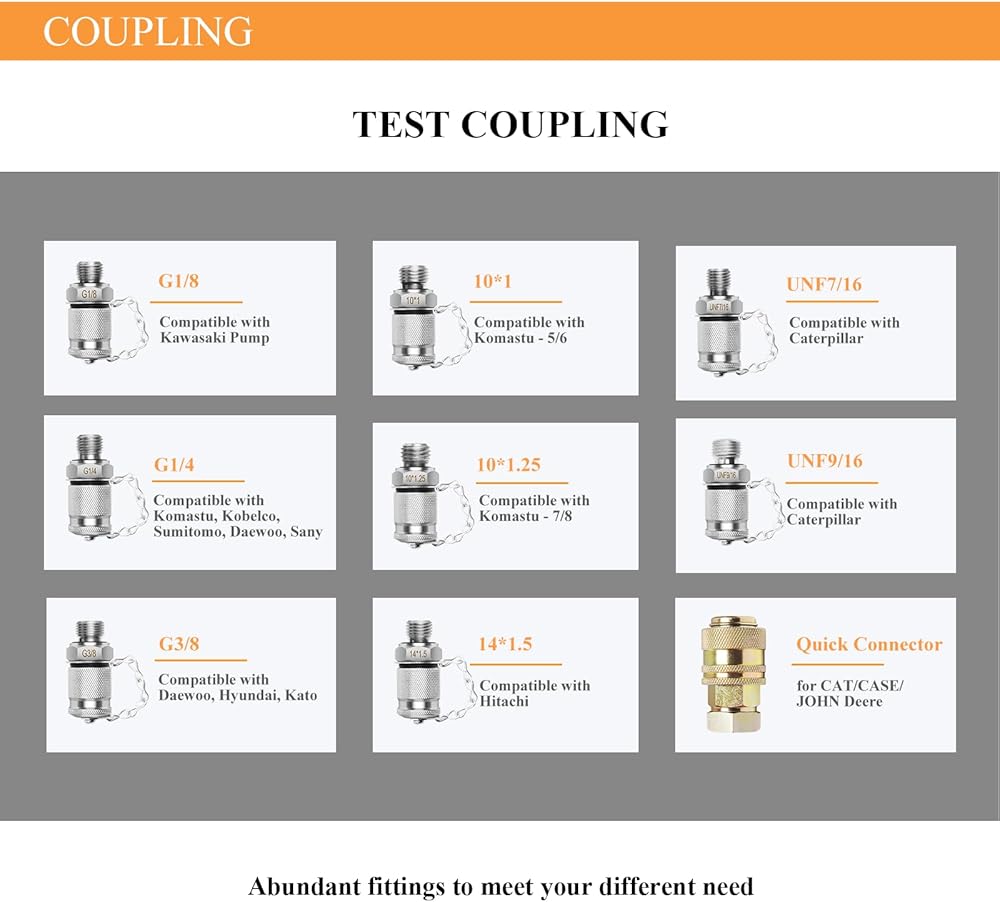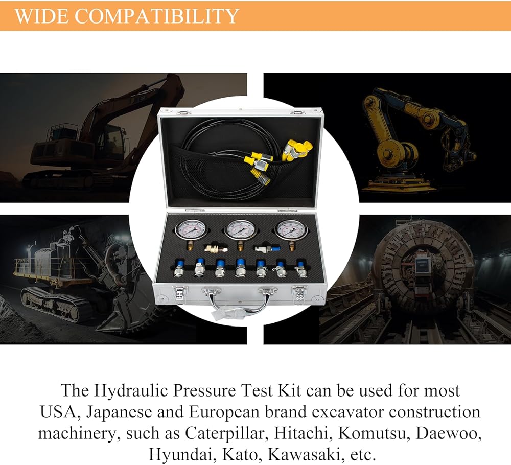 [Wide Compatibility] The Hydraulic Pressure Test Kit can be used for most USA, Japanese and European brand excavator construction machinery, such as Caterpillar, Hitachi, Komutsu, Daewoo, Hyundai, Kato, Kawasaki, etc.