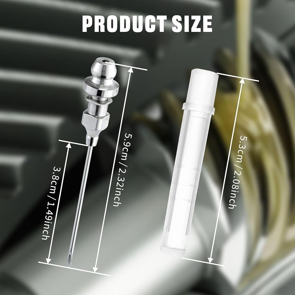 - سوف تحصل على 6 إبر لمسدس الشحوم. يبلغ طول كل إبرة 2.4 بوصة/6.1 سم، ويبلغ طول الطرف 1.44 بوصة/3.66 سم. كما أنها تأتي مع غطاء بلاستيكي واقي.
