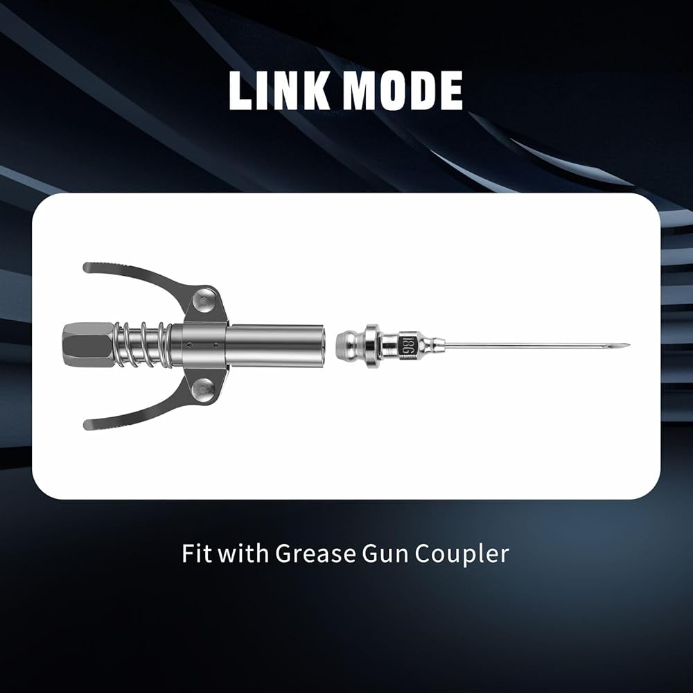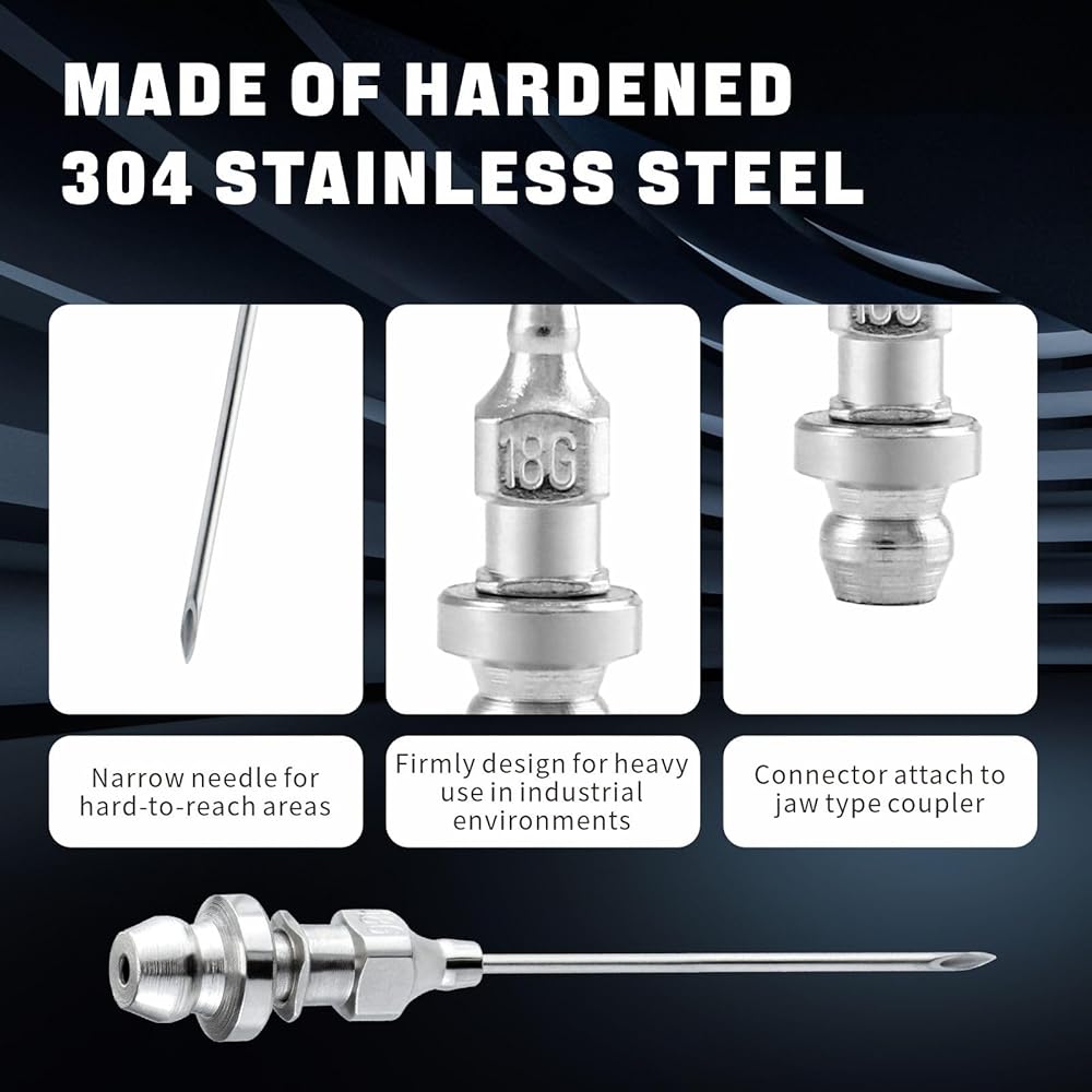 - رأس إبرة مسدس الشحوم مصنوع من الفولاذ المقاوم للصدأ 304، بحجم 18 مقياسًا. يوفر قوة عالية ومناسب لأي مسدس شحم يدوي.