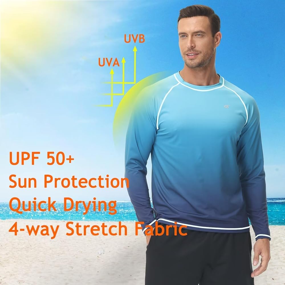 • قمصان السباحة الرجالية لدينا خفيفة الوزن وناعمة. يمكنها أن تبقيك منتعشًا وجافًا طوال اليوم أثناء القيام بالأنشطة الخارجية.