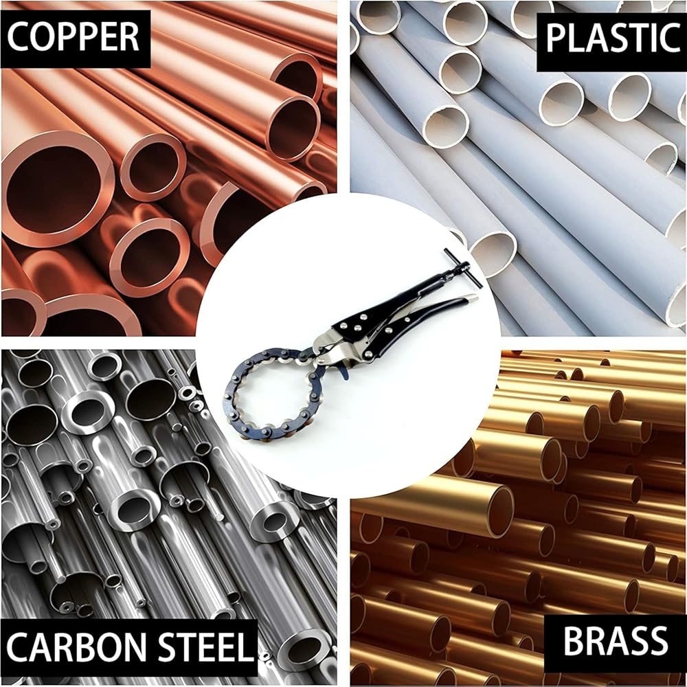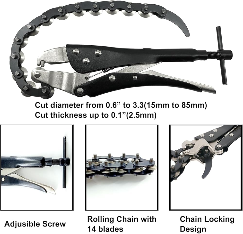 【قاطعة أنابيب العادم】مع سلسلة دوارة مقاس 30 سم (11.8 بوصة) مع 14 شفرة، تقطع قاطعة الأنابيب هذه بسهولة من خلال أنابيب 15-85 مم (0.6 بوصة إلى 3.3 بوصة) من PPR، والفولاذ منخفض الكربون، والنحاس، بسمك أقصى يبلغ 2.5 مللي متر (0.1 بوصة). يرجى ملاحظة أنه غير مناسب للاستخدام على الفولاذ المقاوم للصدأ.