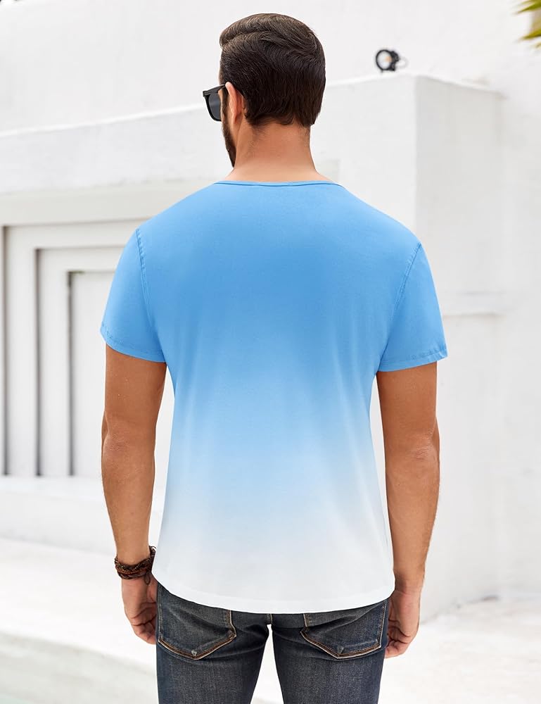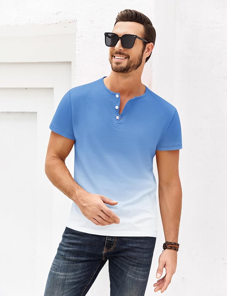 • 【تصميم أنيق】نمط هينلي، رقبة دائرية، كم قصير، يتميز بتفاصيل 3 أزرار، لون متدرج، نمط بسيط. ارفع خزانة ملابسك الصيفية مع تيشيرتات True Classic للرجال من Beotyshow.