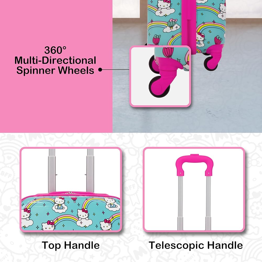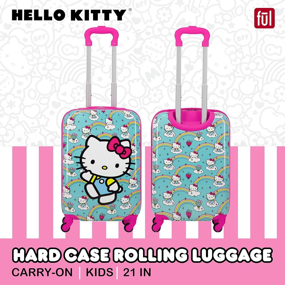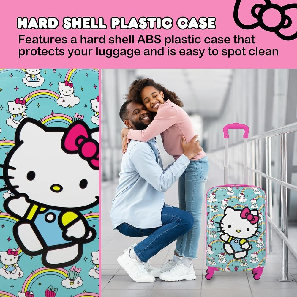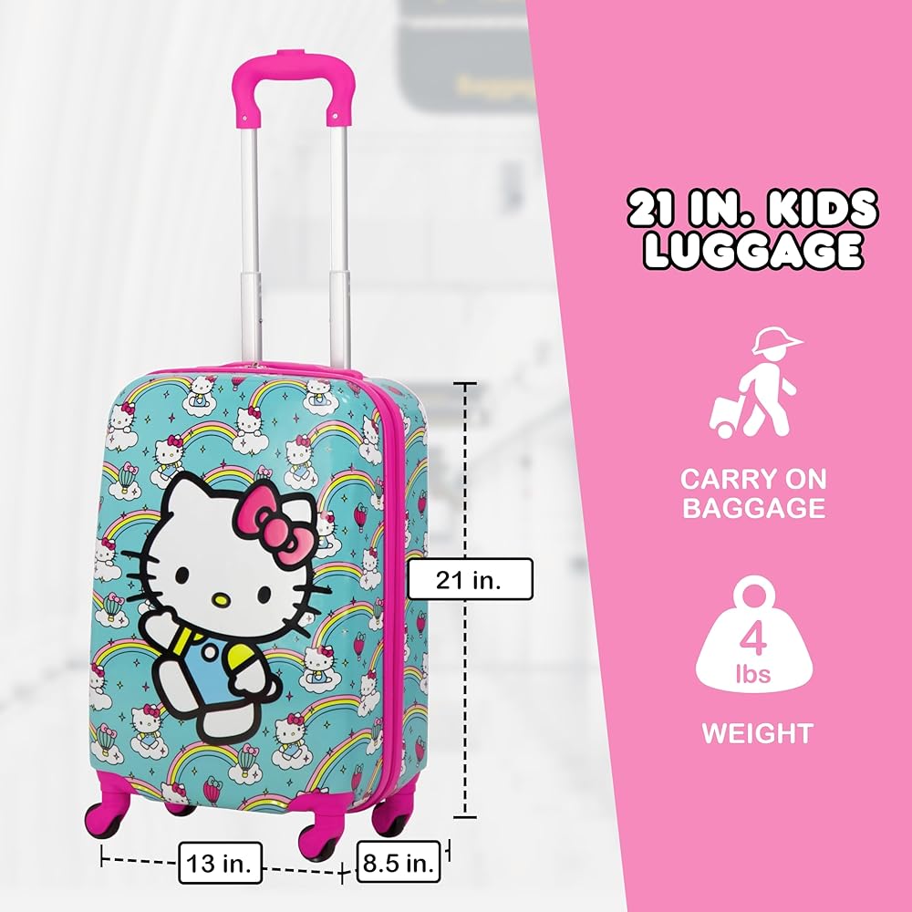 HELLO KITTY TRAVEL LUGGAGE: This cute and stylish hardshell luggage for boys and girls features Hello Kitty against a vibrant turquoise background with lovely rainbows, making this a perfect gift for the Hello Kitty fan in your life, and is perfect for all of your travel needs, with dual zippers to keep your valuables safe and secure inside; this hardshell luggage carrier meets most airline requirements for carry-on luggage and fits into most overhead bins
