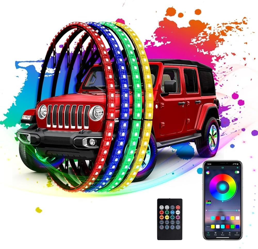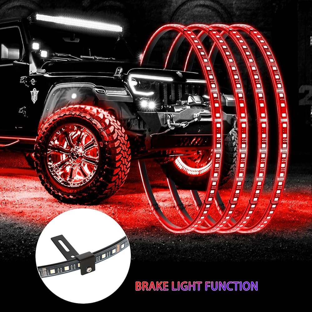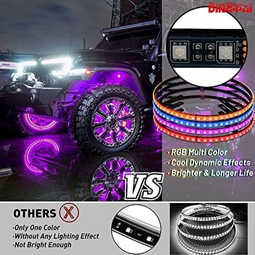 15.5 بوصة أضواء حلقة عجلة LED مع إشارة الانعطاف ووظيفة الكبح وأضواء الحافة مطاردة أضواء العجلات لشاحنة سيارة بيك اب مع إطارات 18 بوصة 19 بوصة يتم التحكم فيها عن طريق جهاز التحكم عن بعد والتطبيق 4 قطع (متعدد الألوان)