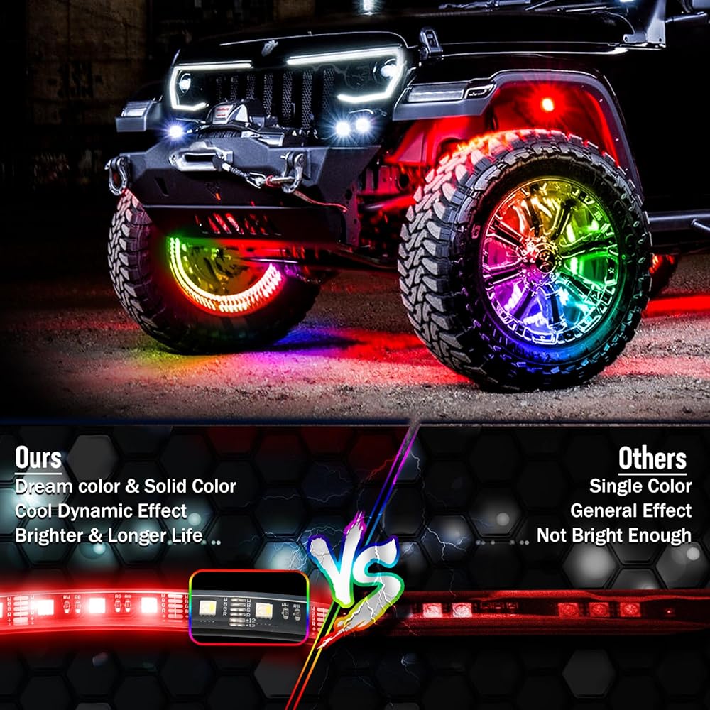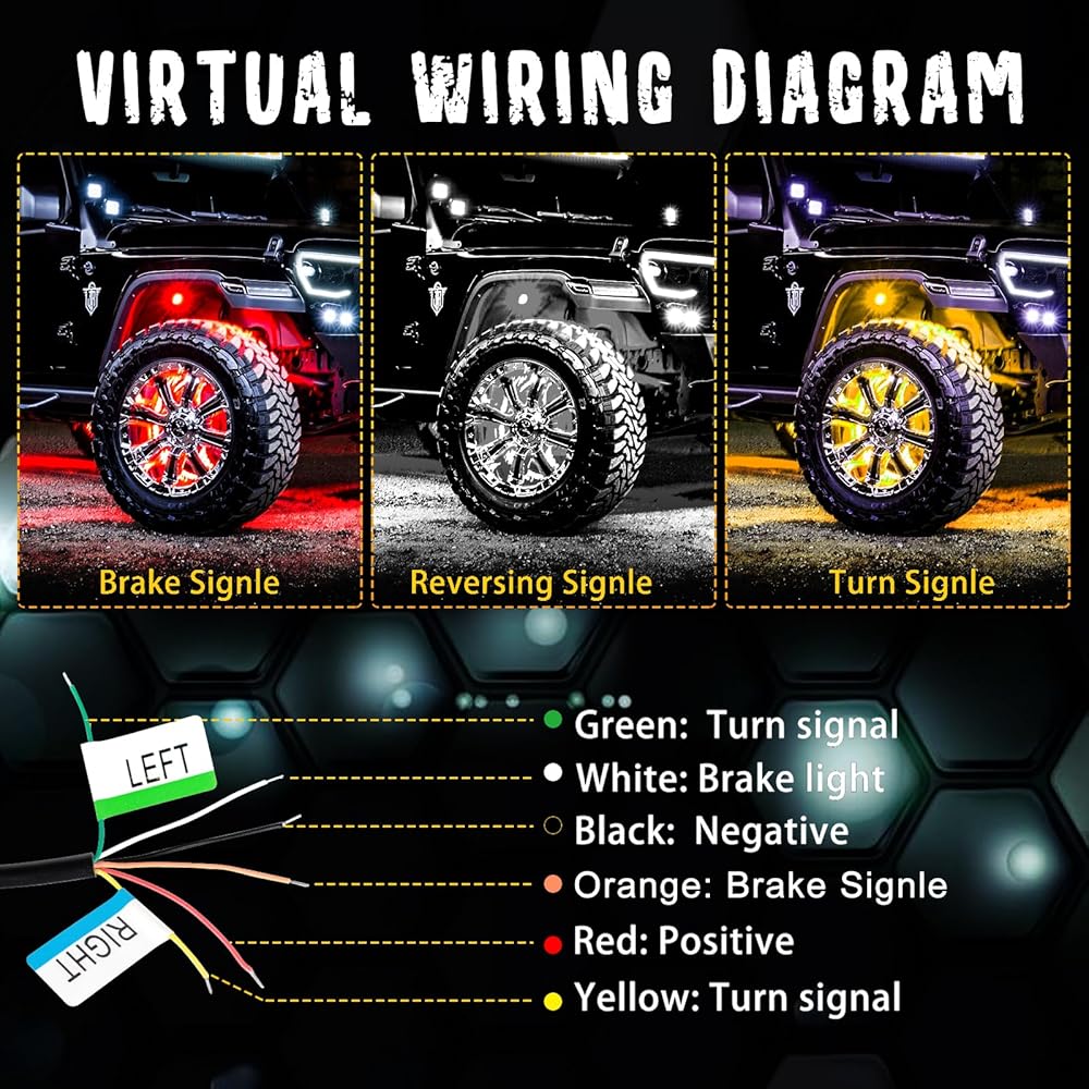 【متعددة الألوان】تحتوي مصابيح العجلات LED على أكثر من 16 مليون لون يمكنك تصميمها بنفسك بالألوان والأنماط التي تريدها. تسمح لك الميزات الديناميكية بتشغيل أنماط ألوان متحركة متعددة من خلال حلقة العجلة، مما يخلق تأثير إضاءة حيويًا ملفتًا للنظر. مصابيح العجلة مجهزة بوظائف الفرامل وإشارة الانعطاف.