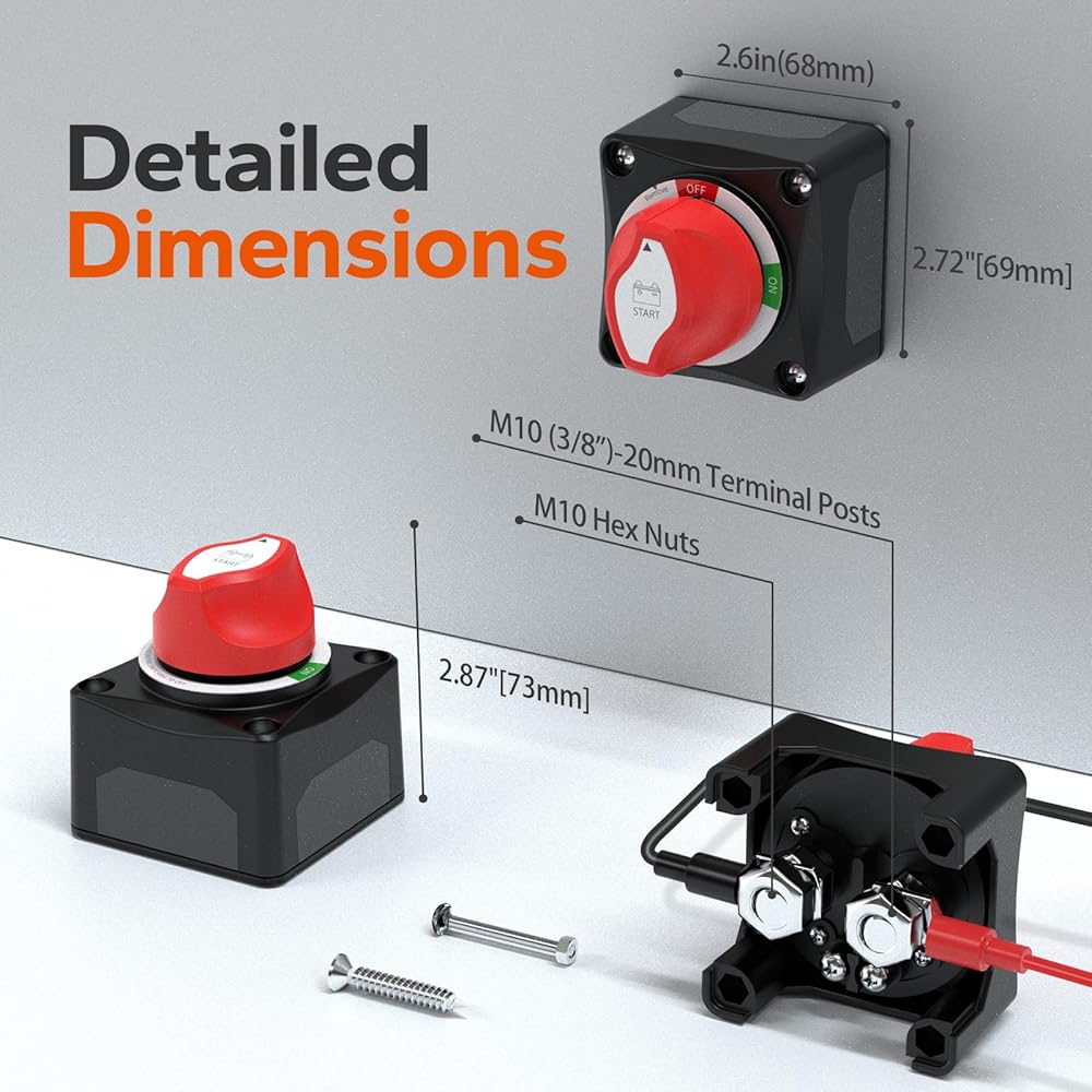 【سهل التشغيل】وضعين للتشغيل/الإيقاف، للاستخدام في أنظمة تيار مستمر 12-48 فولت. القيمة المقدرة: 275 أمبير تيار مستمر مستمر، 455 أمبير تيار مستمر متقطع (5 دقائق)، 1250 أمبير تيار مستمر (10 ثوانٍ). 4 حواجز قابلة للفصل مناسبة لاحتياجات الأسلاك في سيناريوهات مختلفة.