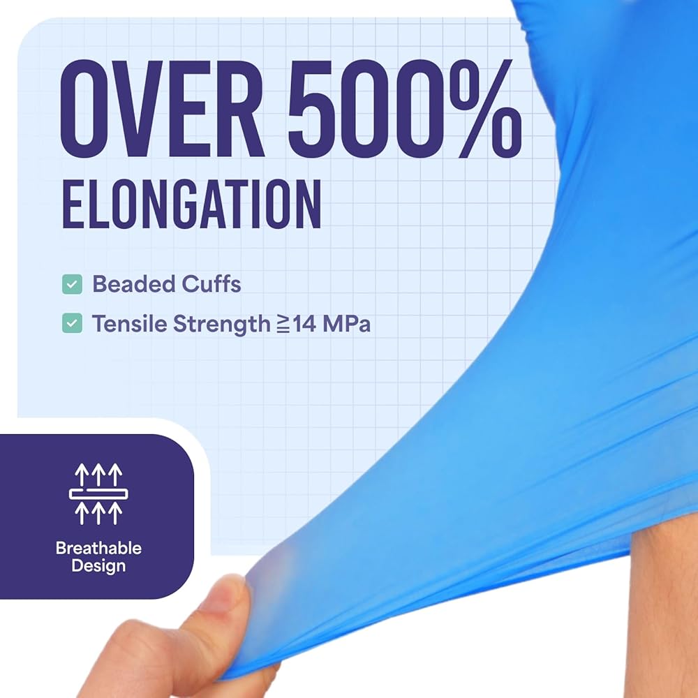 • [Over 500% Elongation] - With a tensile strength over 14 MPa and a breathable design, our premium medical gloves are crafted for healthcare professionals and suited for everyday use. These gloves provide superior protection, offering enhanced dexterity for a wide range of applications including medical procedures, first aid, and hygiene tasks. Ensure optimal performance and confidence in any demanding setting with gloves that blend robust protection with comfort.