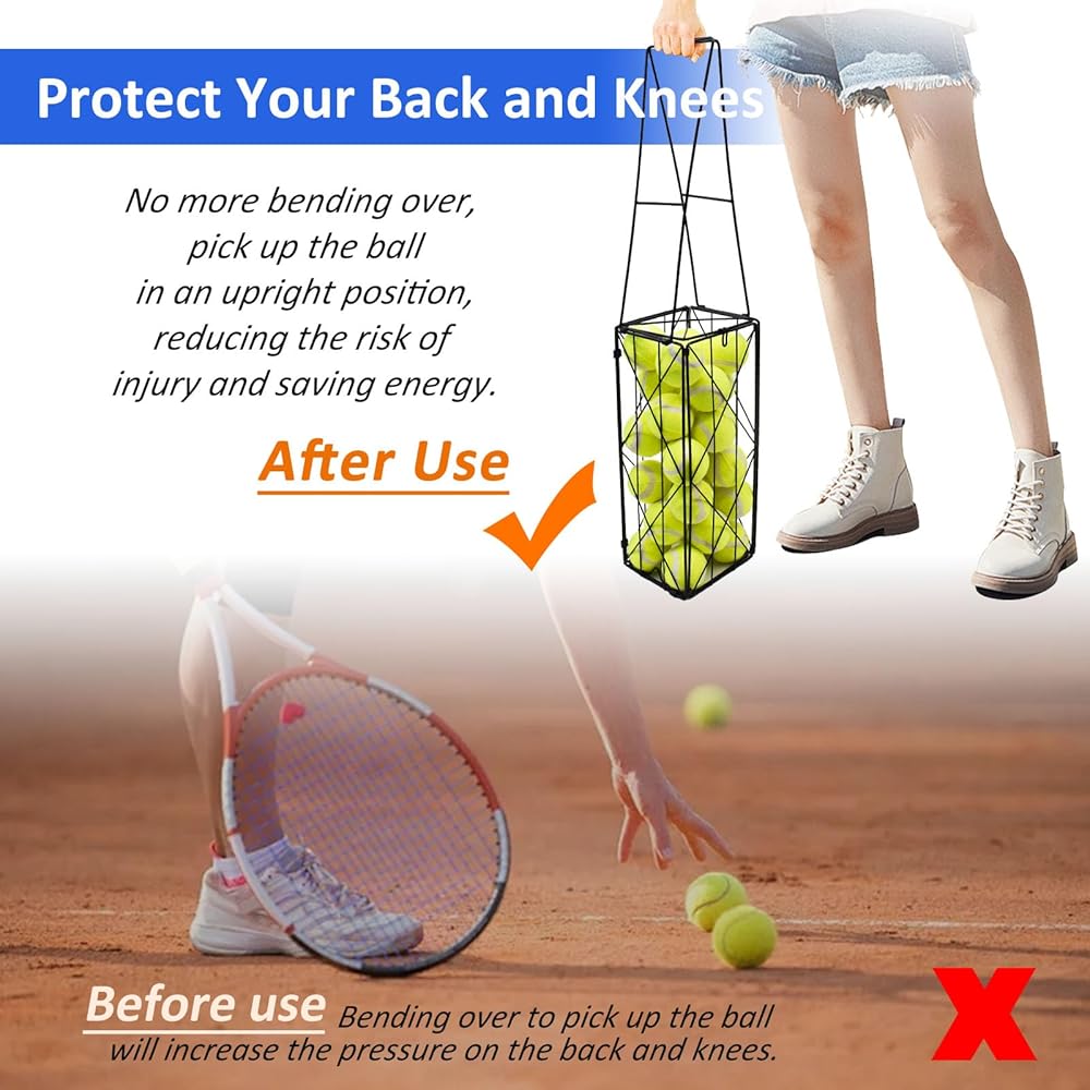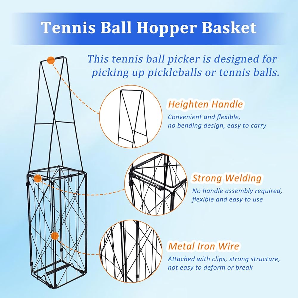 🌟【Friendly Function】Our tennis pickleball hopper is equipped with heighten handles 14.96", easy to carry to any tennis court. With this pickleball tennis picker upper basket, you can pick up the ball in an upright position. No longer need to bend over again, protecting your back, hips and knees at all times.