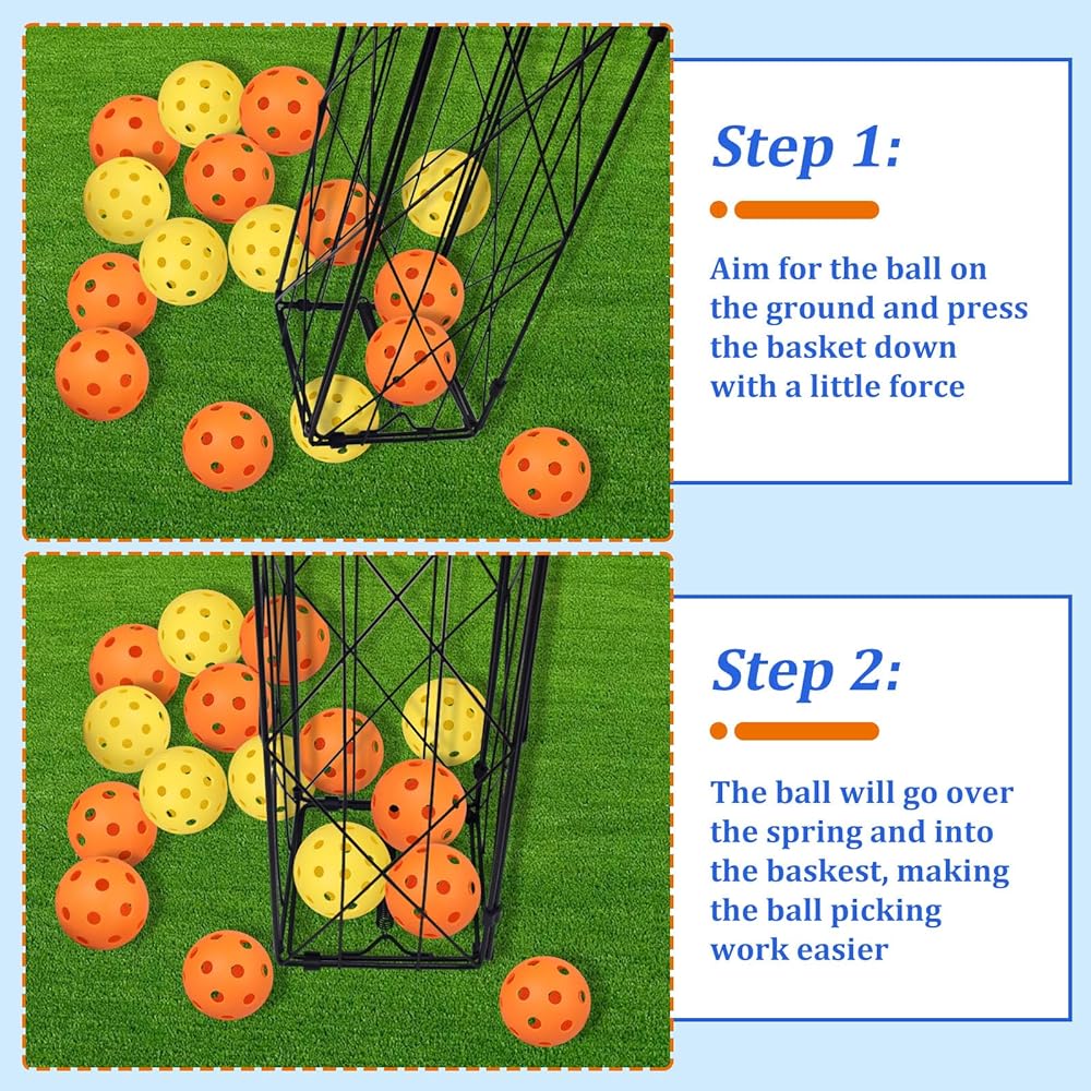 🌟【Efficient Collection】This tennis ball pickleball collector uses the bottom spring design, strong resilience, easy to grab and prevent the ball from falling effectively. You just need to align the basket at the ball on the ground, press down, pick it up without damaging, and then start over.