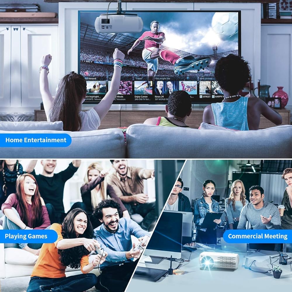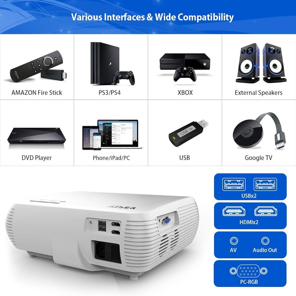 • [شاشة عملاقة وتوافق واسع] يوفر جهاز عرض الفيديو حجم الإسقاط من 45 بوصة إلى 200 بوصة حسب المسافة (1.5 - 5.5 متر) و3 أمتار هي مسافة العرض الموصى بها. مزود بمنفذين HDMI ومنفذين USB ومنفذ VGA ومنفذ AV، ويمكن توصيل جهاز العرض هذا بسهولة بصندوق التلفزيون وتلفزيون Amazon Stick وChromecast والكمبيوتر الشخصي والكمبيوتر المحمول والكمبيوتر اللوحي ومكبرات الصوت الخارجية وبلاي ستيشن وXbox ومشغل DVD وقارئ البطاقات ، USB، ومشغلات الوسائط، وأجهزة iPad، وiPhone، والهواتف الذكية التي تعمل بنظام Android.
