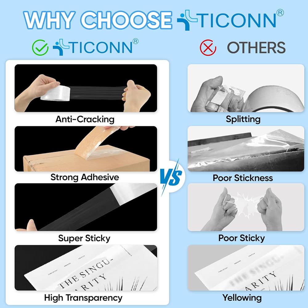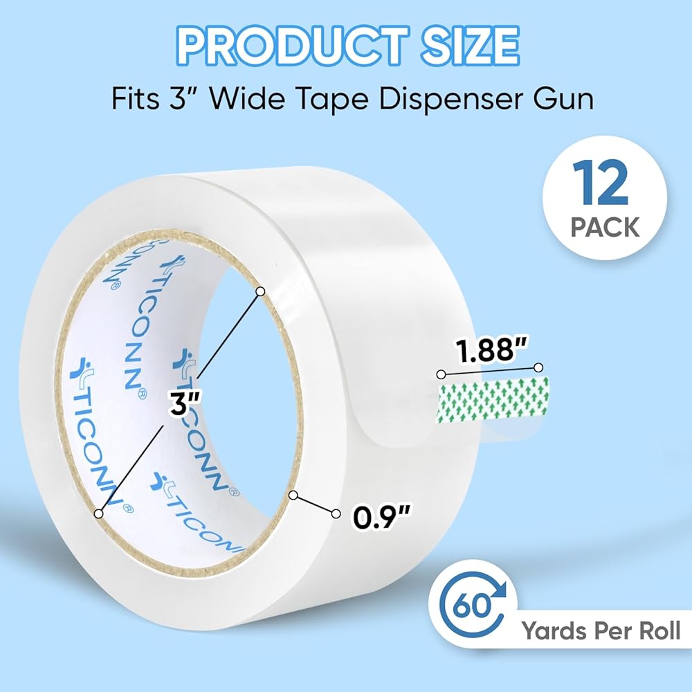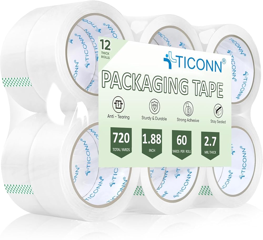 [ممتاز وصديق للبيئة] تم تصميم شريط التغليف TICONN للاستخدام الشاق، يبلغ قياس كل لفة 60 ياردة × 1.88 بوصة عرضًا × 2.7 مل سمكًا، مما يضمن إغلاق قوي وموثوق لحزمك. مصنوعة من مواد صديقة للبيئة، وتحتوي على لا يحتوي على الفورمالديهايد الضار أو الروائح الكريهة، مما يوفر لك حلاً آمنًا وصديقًا للبيئة.