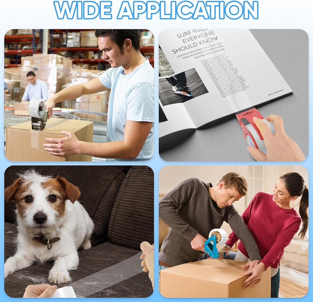 [استخدام متعدد الاستخدامات] شريط التغليف الشفاف متوافق مع موزعات الأشرطة الأساسية مقاس 3 بوصات ومسدسات الأشرطة للمستودعات والمنزل والجراجات والاستخدام المكتبي. يستخدم على نطاق واسع للشحن والتعبئة وإغلاق الصناديق والكرتون وإزالة غبار الملابس أو شعر الحيوانات الأليفة. .