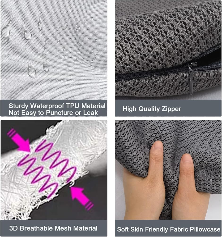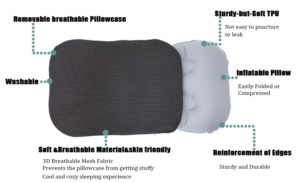 ✅غطاء وسادة استثنائي للتهوية: يسمح البناء الشبكي ثلاثي الأبعاد لهذه الوسادة القابلة للنفخ بتدفق هواء وتهوية لا مثيل لهما. يعزز التصميم المفتوح المثقوب التهوية الطبيعية، ويمنع تراكم الحرارة والرطوبة التي لا يمكن أن تؤدي إلى تجربة نوم خانقة وغير مريحة، حتى في الظروف الأكثر دفئًا.