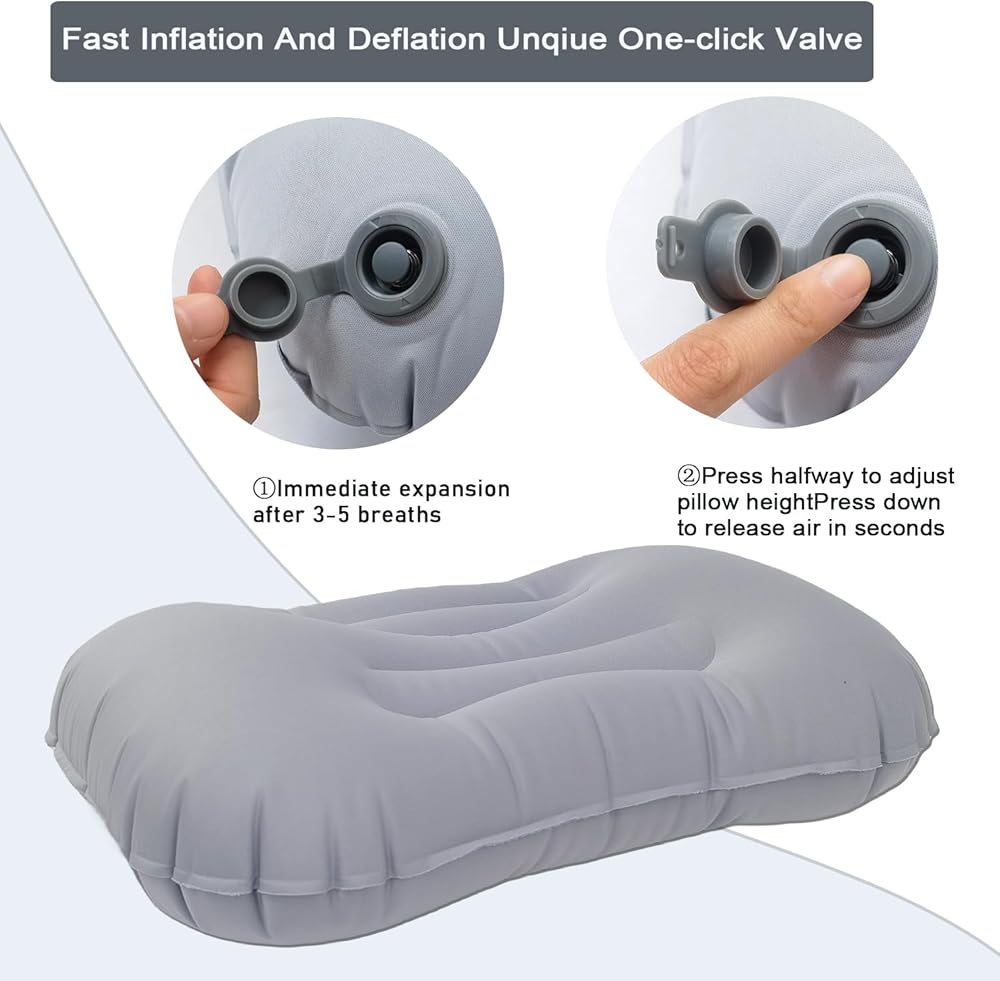 ✅نفخ بدون جهد لراحة فورية: تتميز وسادة التخييم الخاصة بنا بصمام هواء فريد ثنائي الاتجاه يسمح لك بنفخها خلال 3-5 أنفاس فقط، دون أي هروب للهواء. يضمن هذا التصميم المبتكر إمكانية إعداد سطح نوم مريح بسرعة أينما تأخذك مغامراتك.