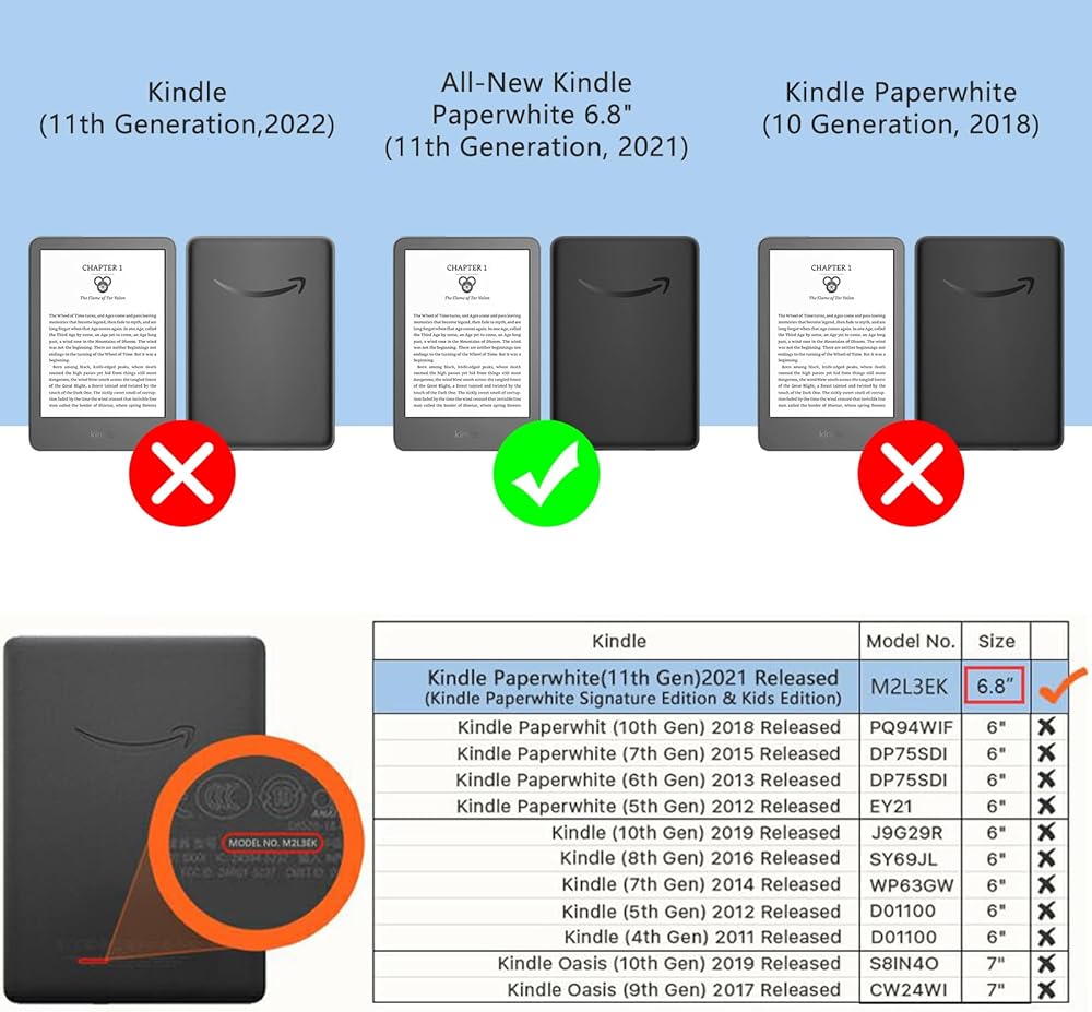 • 【لجهاز Kindle Paperwhite 2021 】- مصمم للجيل الحادي عشر من Kindle Paperwhite أو Kindle Paperwhite Signature Edition 6.8 بوصة (إصدار 2021، رقم الموديل: M2L3EK /M2L4EK). لا يناسب أجهزة Kindle الأخرى من الجيل السابق.