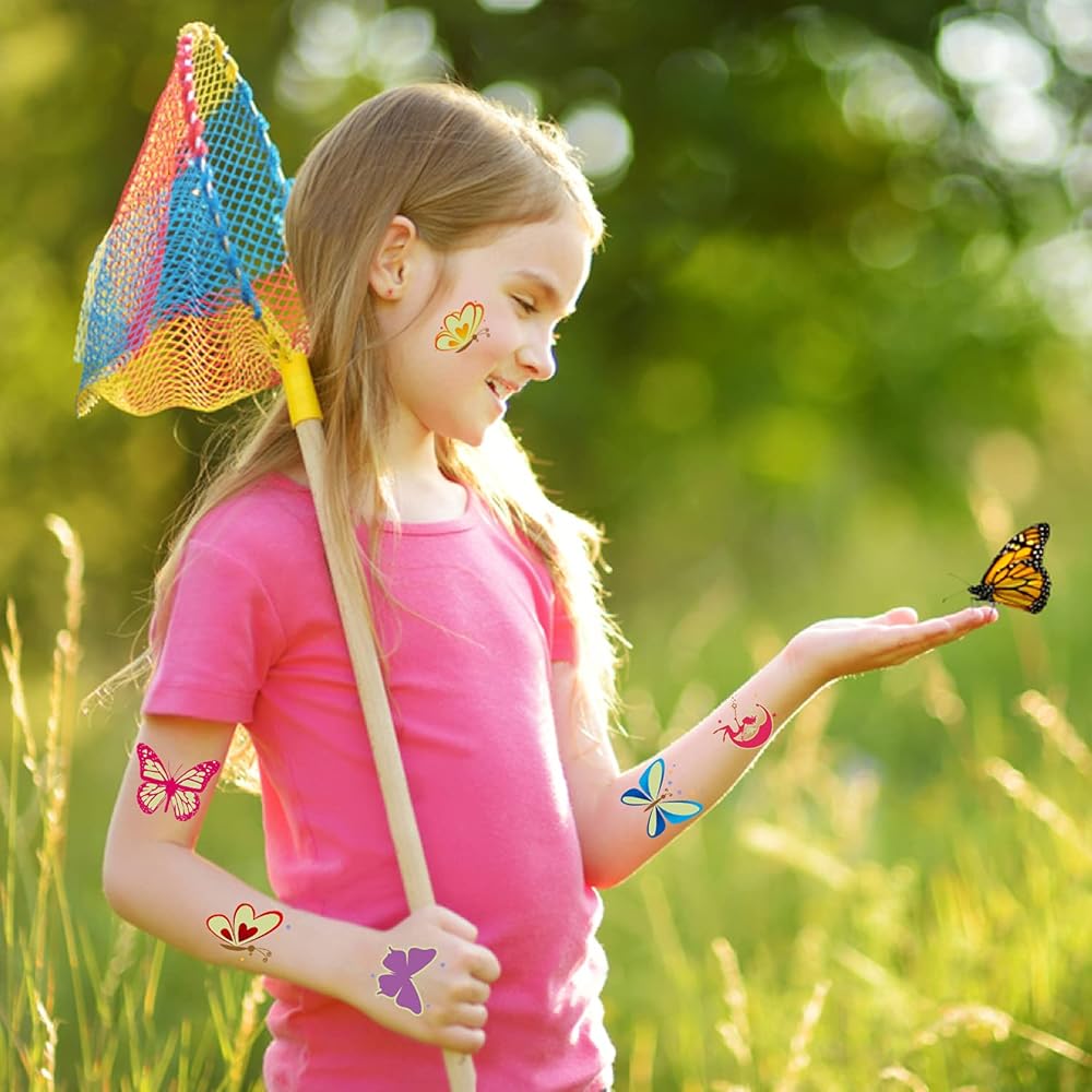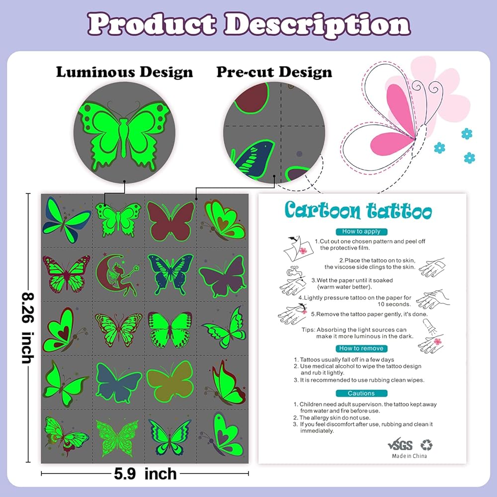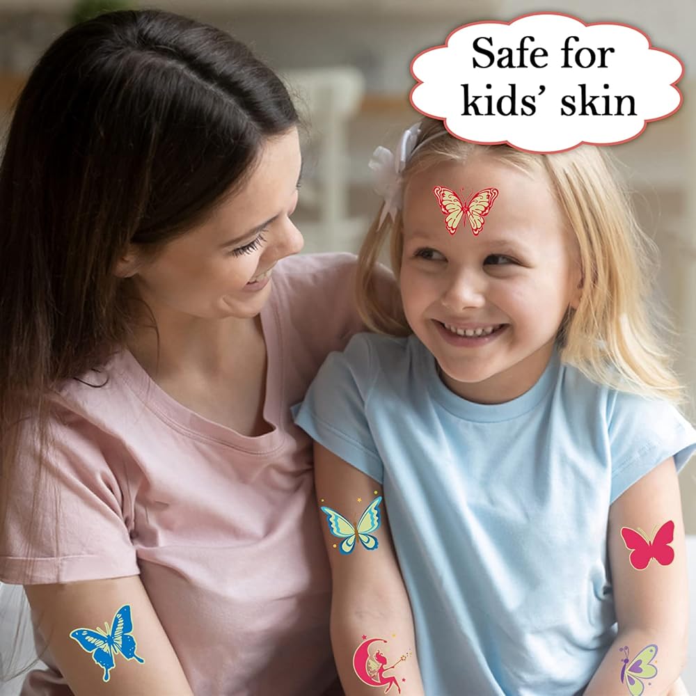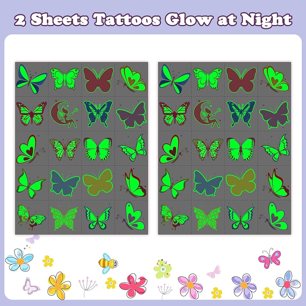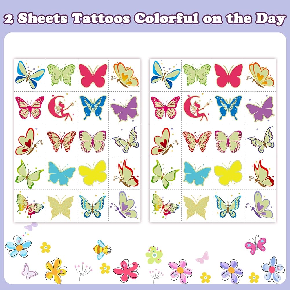 • 【Plentiful and High Quality Butterflies】You will get 40 styles perfect luminous butterfly stickers! 2 Sheets in a pack, each sheet size: 8.3x5.9 inch. These tattoos uses special pre-cutted design, which is safe for kids to far away from harm of scissors. High quality printing makes patterns colorful and realistic, waterproof and long lasting. These butterflies can last for 3-5 days. Importantly, which is non-toxic and harmless to kids, non-allergenic for kids skin.