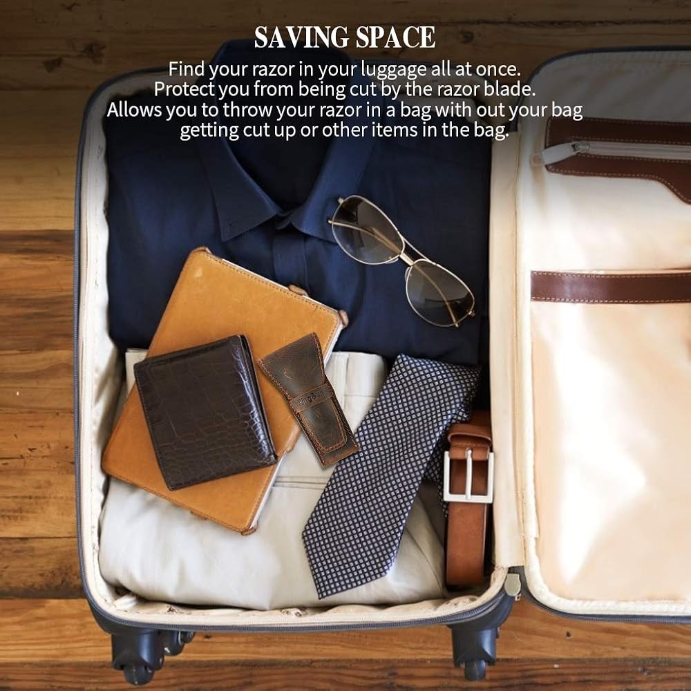 حقيبة السفر لماكينة الحلاقة: يمكن لحامل ماكينة الحلاقة الجلدية بأمان منع إصبعك من القطع، والحفاظ على ماكينة الحلاقة آمنة وآمنة عند السفر. استخدم حقيبة الحلاقة للسفر الخاصة بنا، لن تقطع الأصابع أثناء صيد الشفرة في حقيبة أدوات التجميل.
