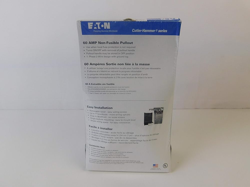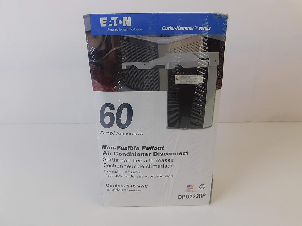 60A pullout air conditioner disconnect, no fuse, double pole, solid neutral,120/240V, individual consumer pack with upc bar code. The product is manufactured in china. The product is highly durable. .