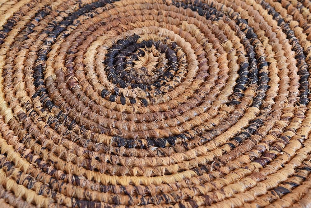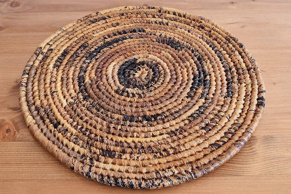 These trivets are handmade in Rwanda by our artisans team specialized in sisal and banana fiber baskets and trivets. For this pure handmade we use locally grown, renewable resources such as banana stalks (use to weave the external part of trivet) and banana leaves fibers (inside part of trivet). When start to get dry and turns golden, brown, banana stalks and leaves are selected by the artisan from local villages where naturally grows and transformed into this beautiful work of art. After the trivets are woven they are smoked over a coconut husk to obtain their golden brown color. This process leaves behind a smoky scent which will dissipate with time. It can be used as a table or furniture display, for dining table to protect from heat damage or as a original gift (definitely a hit of a gift). Approximately 8'' Diameter. Handmade from Africa | Authentic & Unique | Fair Trade Product | 100% Handmade with love, passion and pride | A great opportunity to support African Artisans.