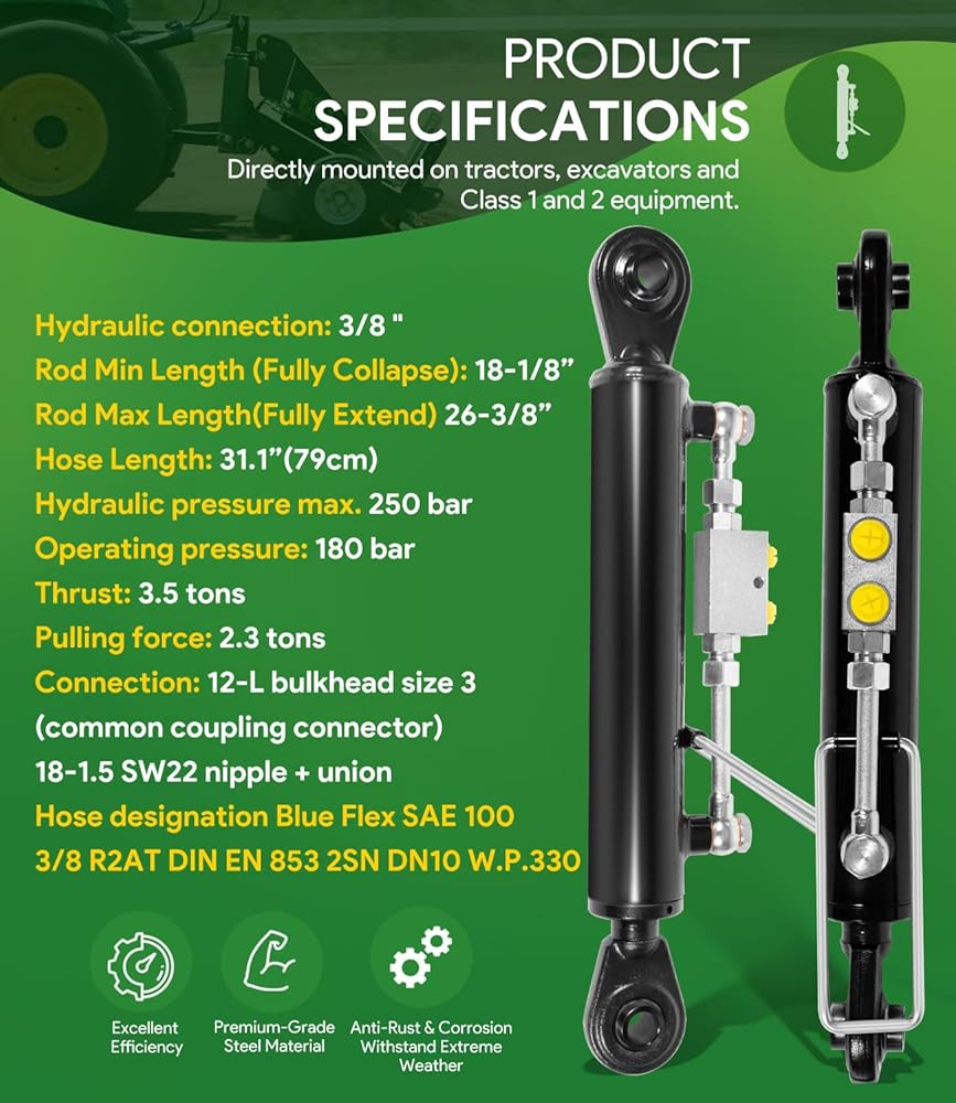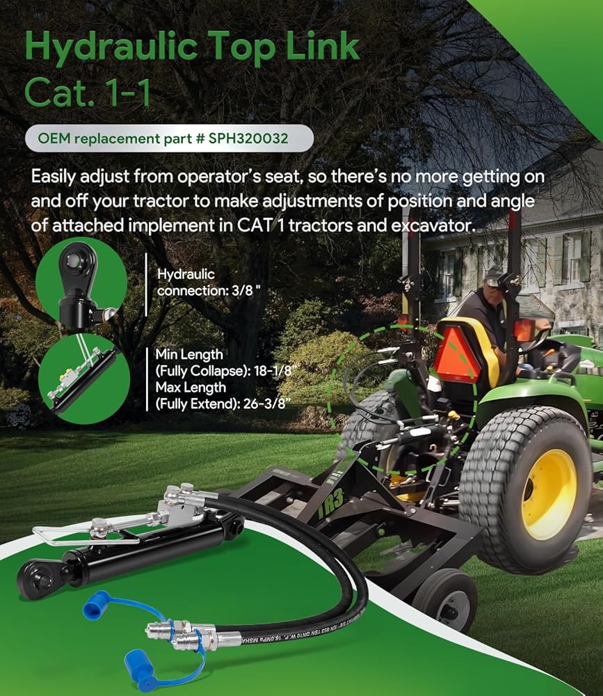 • 【Perfect Fit】 Hydraulic Top Link Cat. 1-1. Hydraulic Pin Connection Diameter: 3/8 ". Min Length (Fully Collapse): 18-1/8”, Max Length(Fully Extend): 26-3/8”. Hose Length: 31.1”(79cm). Directly mounted on tractors, excavators and Class 1 and 2 equipment and is widely used in waste, recycling, construction, transportation, agriculture, material treatment and other industries. Direct replacement for your existing top link on the tractor and makes your daily work easier. OE Replacement Part # SPH320