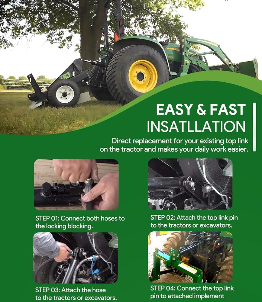 • 【2 Way Check Valve Design】 Hydraulic top link cat features two-way check valve for both retraction and extension of the hydraulic rod. Combined with the unbeatable integrated locking block, the oil is enclosed in the cylinder by a check valve. Only when there is oil pressure from the tractor again does the valve open and the cylinder can be adjusted. Safe and stable design to prevent cylinder from leakage.