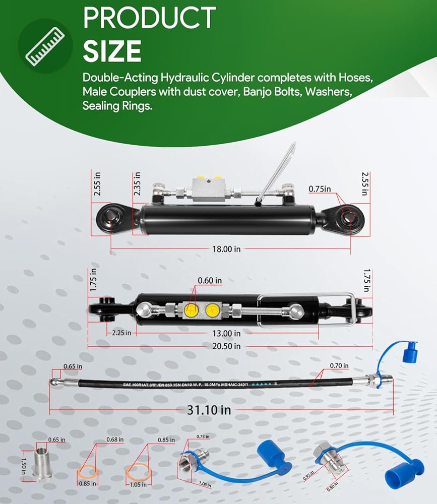 • 【What You Get】 Complete Hydraulic Top Link not only includes Double-Acting Hydraulic Cylinder, but also complete with Hoses, Male Couplers with dust cover, Banjo Bolts, Washers, Sealing Rings. Easy installation with all necessary components, no more additional configuration and purchase.
