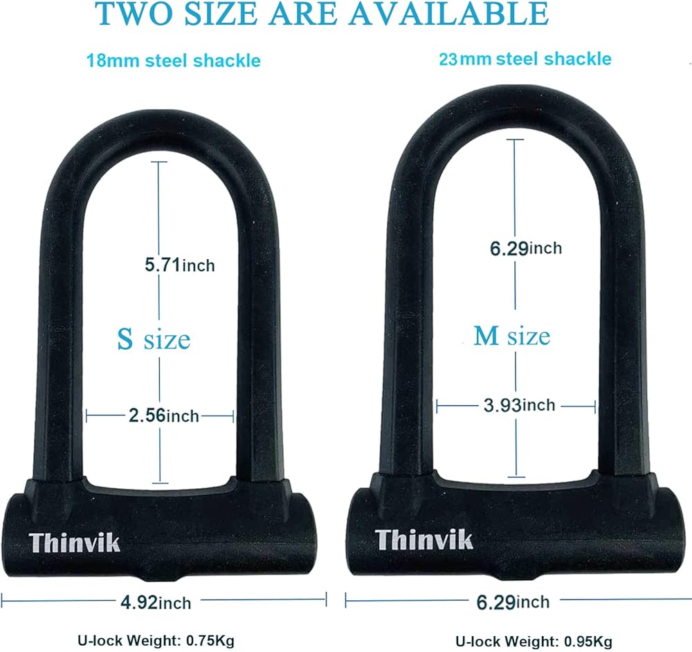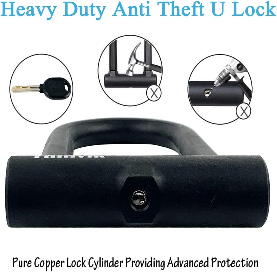【قوي ومتين】قفل Thinvik Bike U مقاوم للقطع، مصنوع من الفولاذ الصلب عالي الأداء مقاس 18 مم وجل السيليكا الصديق للبيئة، مضاد لـ 12 طنًا من المقصات الهيدروليكية، ومقاوم للرافعة المالية ومقاوم للحفر، وسبائك فولاذية عالية الجودة. مغطى بغطاء من السيليكون مقاس 0.10 بوصة، سيبقى القفل محميًا من التآكل والتمزق، بينما يحمي أيضًا دراجتك من الخدوش. من الصعب قطعه أو كسره أو فتحه، قوي ومتين.