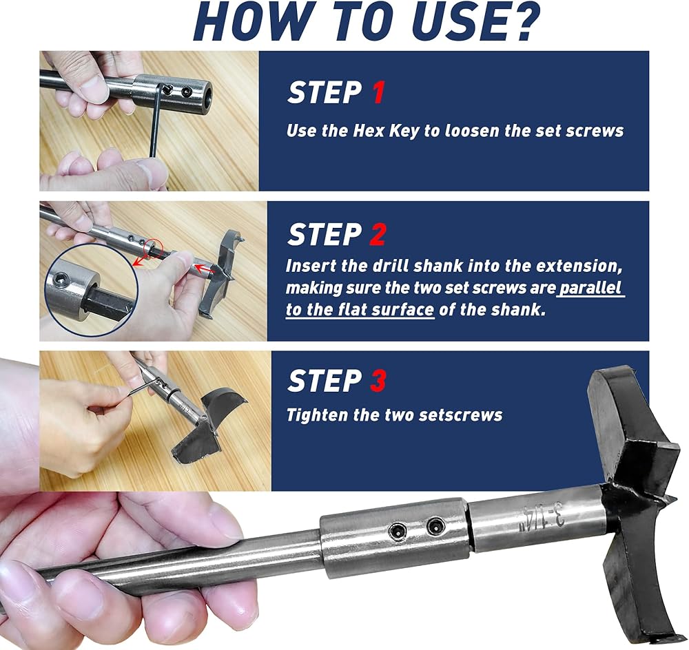 👷Two set screws and hex key included. To fasten the shank in place, use the hex key to tighten these screws;
